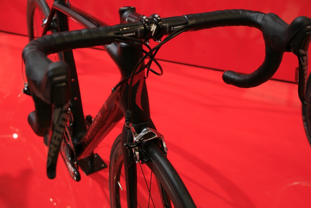 A stand túloldalán (mint a női és férfi szakasz a cipőboltban) az új, négyes szériaszámú Tarmac SL kimondottan férfias design-t kapott. A mattfekete SL4 az egész Eurobike egyik legszebb országútija volt. Sajnos a Demo Day-en nem maradt időnk tesztelni, pedig érdekes lett volna, ugyanis a merevség-komfort viszonylatában etalon Tarmac SL3-hez képest állítólag kicsit kényelmesebb lett. Kíváncsiak lettünk volna, milyen az a kerékpár, ami változott egyik irányba a „tökéleteshez” képest….