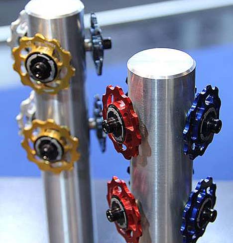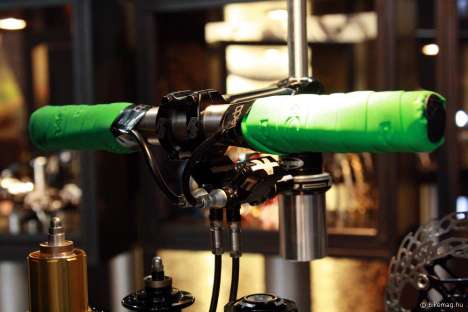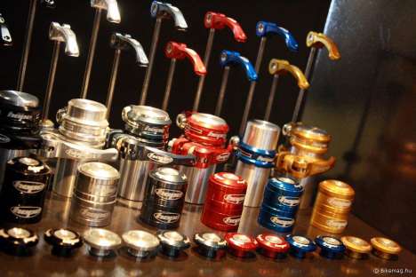 2013-as újdonság még a váltógörgő, amely a legendás márka jellegéből adódóan természetesen CNC-zett aluból készül, a csapágyazást rozsdamentes acél ipari darabokra bízzák, még a porvédő is egyedileg CNC-zett rajta. Több váltótípushoz gyártják., és persze adott a standard Hope színválaszték is. Hasonlóképpen megcsodáltuk a nyeregszárbilincsválasztékot, amely évek óta fémjelzi az angol gyártót: van természetesen csavaros és gyorszáras, 2013-ban pedig az egyre gyakoribb 30 mm-es méret is. Kormányszárak terén pedig a Boxxeres (35 mm átmérő), illetve a Fox 40-es integrált elégít ki egyedi igényeket, párját ritkító mérnöki megoldást alakalmazva, természetesen csodaszép kidolgozásban és a hat ikonikus szín bármelyikében.