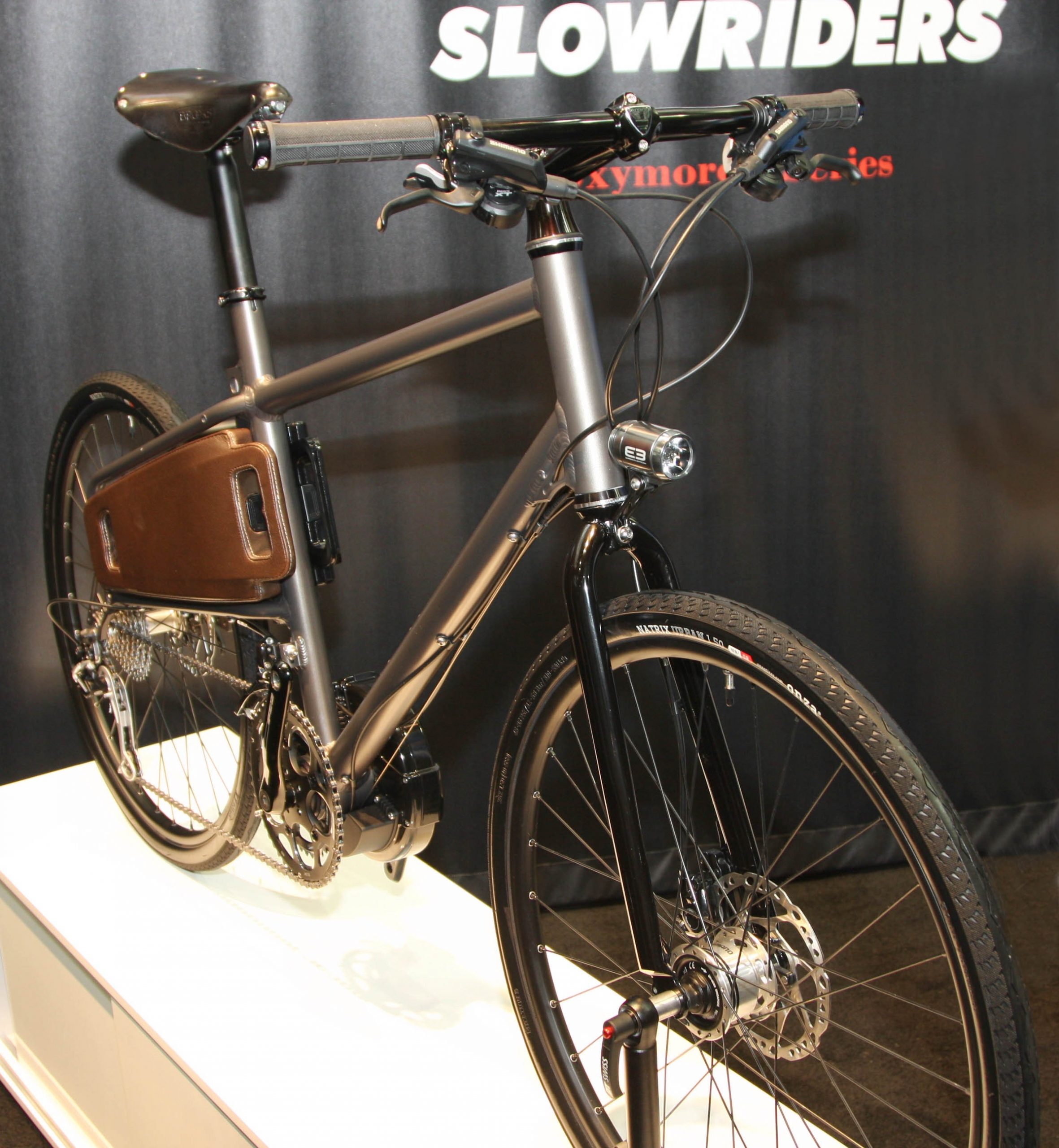 Ez a gép nem is elsősorban, mint jó trekking gép fogott meg, hanem az, ami a lánc és támvillák között van. Az a kis, elképesztően stílusos bőrrel bevont táska, szütyő, nevezd, ahogy akarod. Közelebbről megnézve kiderült, hogy azok, – merthogy ketten vannak – rejtik az akku pakkot, mivel ez egy pedelec E-Bike.  Az Eurobike-on elég sok E-bike-ot megnéztünk, de ezen gépek 90%-a bizony elég bumfordi, magyarán sz.rul néz ki, vagy az akku pakk, vagy az elektromotor elhelyezkedése miatt. És ez komoly hátráltató tényező a vásárláskor.