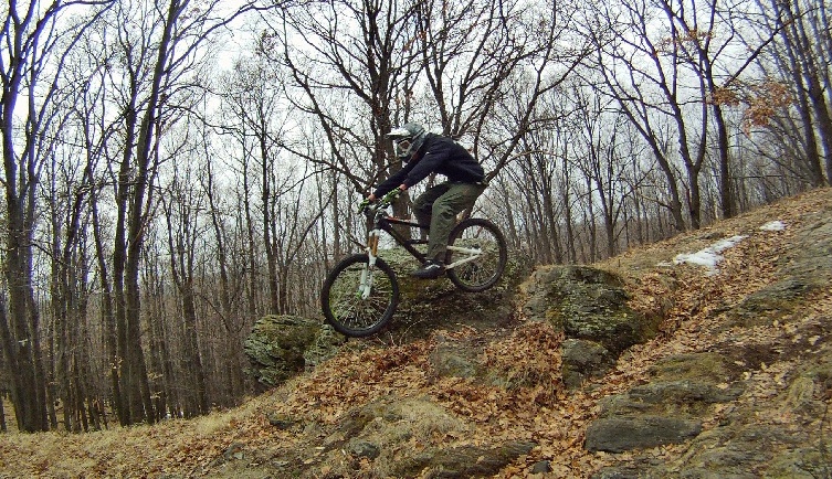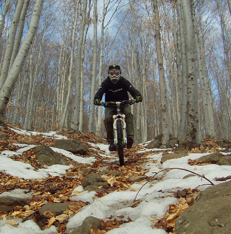 Mivel már eleget szenvedtem, gondoltam valami hosszú utat válaszok, ahol végre kiélvezhetem a bringát úgy igazán. Van is egy jó hosszú út Mátrafüredre, pár tekerős szakasszal, pont ideális a bringa stílusához. Egy dolgot felejtettem csak el, hogy még hó van! Így, míg eljutottam a turistaút kezdetéhez, át kellett verekednem magam egy kis lefagyott 20-40cm havon és némi kidőlt/kivágott fán. Igazi „élmény” volt, és ezúton köszönöm a favágóknak a rögtönzött akadály pályát. No de végre elkezdett lejteni és belecsapott a menetszél az arcomba. A bringával minden rendben volt, a láncfeszítőn hasznosnak bizonyult a taco, sokat segített a kövek között és a kidőlt fákon való átjutásban. A nyeregcsövet meg kifejezetten ajánlom minden hasonló érdeklődésű bringásnak. Lefelé letoltam, majd amint jött egy kis tekerősebb szakasz, megnyomtam a kart és már is kényelmesen ülve tekerhettem. Majd amint újra jött a gurulás, „lifteztem” egy kicsit lefelé és máris elegendő hely volt a nyereg és köztem.