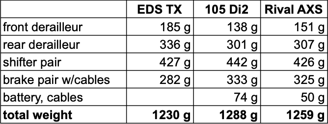 I compared the EDS TX with Shimano 105 Di2 and SRAM Rival AXS. I weighed the components and tried to find reliable data for the other two systems. Based on my measurements, the EDS TX is the lightest, but all three groupsets are very close to each other.