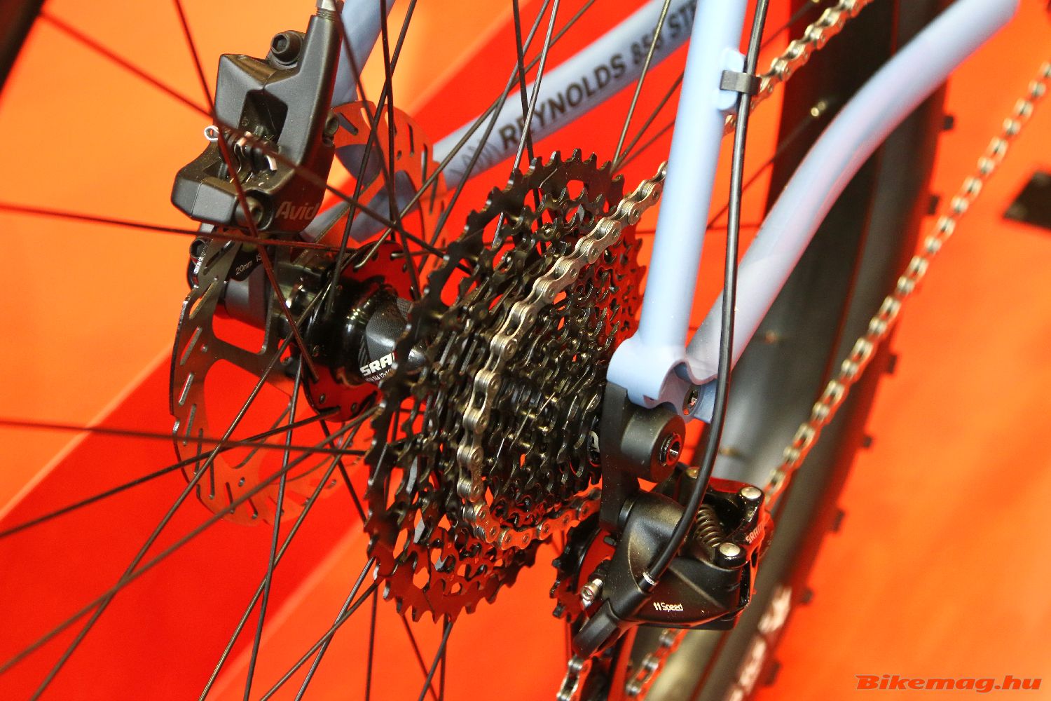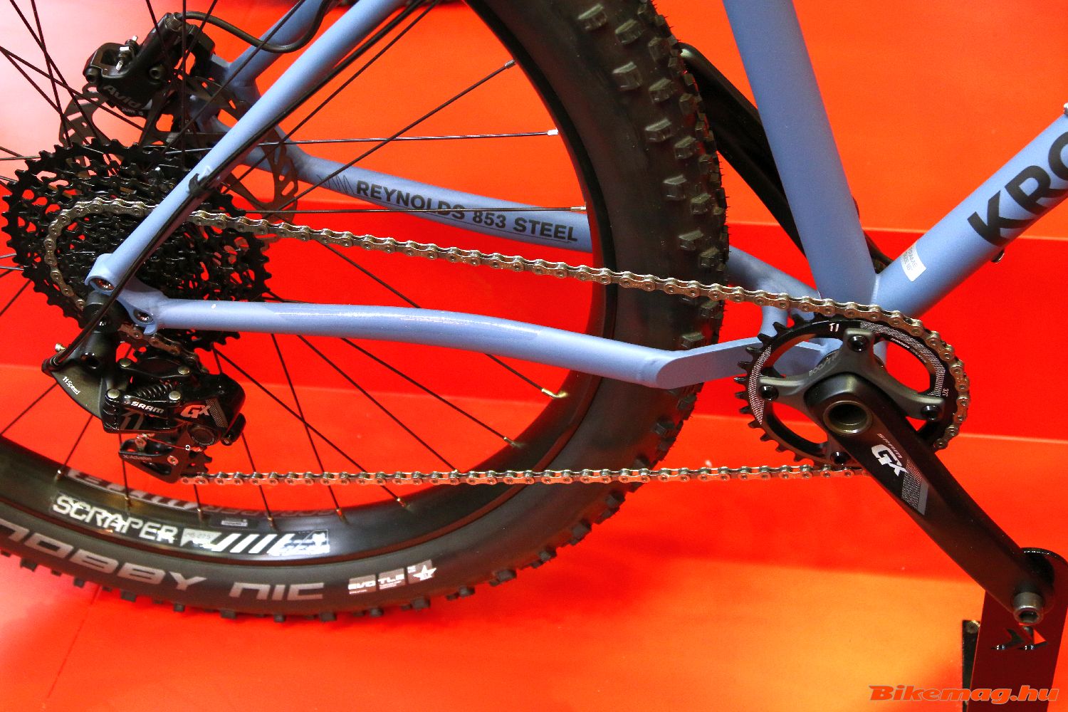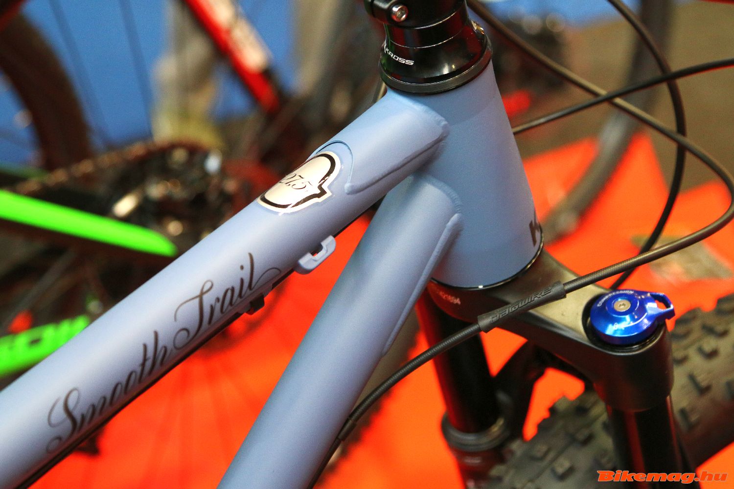 A már emlegetett hiánypótlót, azaz a 650B+ gépet Smooth Trail-nek hívják, és imádtuk! Eleve minőségi Reynolds 853-as acél csövekből készül, a tapered fejcső a felsőcsőnél a klasszikus iskola szerint felül lapolt, és még dropper post is helyet kapott benne! A sárférőhellyel nem lesz gond, bár ehhez fel kellett áldozni az első váltás lehetőségét, hogy a láncvillák elég szélesek lehessenek.