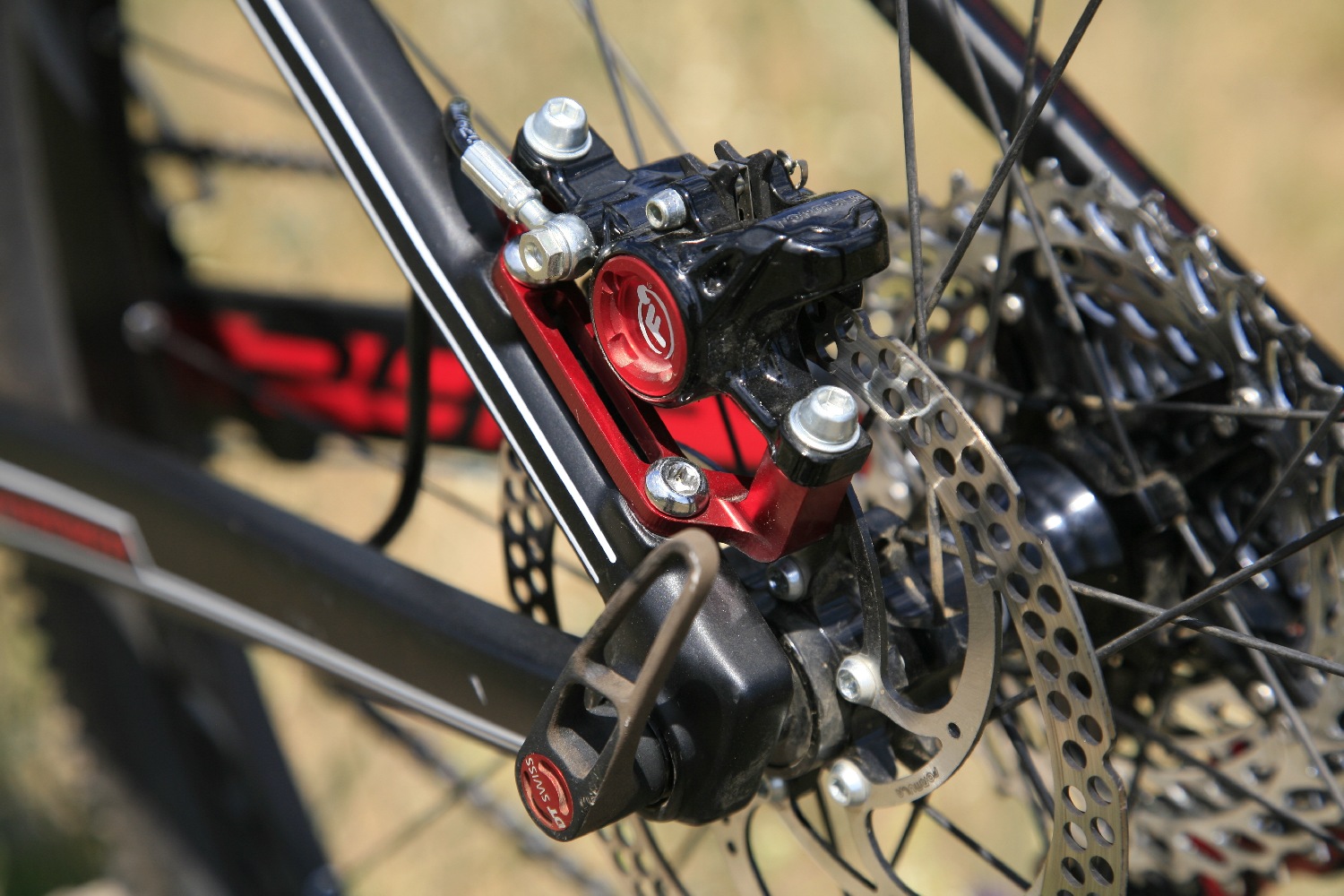 Érdekesség a Pro SL-en, hogy a Formula RX fékek elöl 160-as, hátul viszont csak 140-es tárcsára harapnak. Elegendő fékerőt adnak egy XC-géphez így is, és az adagolhatóság is jó volt. Sajnos a tárcsa anyaga viszont talán nem a legjobb, elöl nálam hamar – gyakorlatilag minden ok nélkül – nyolcas lett benne. Ugyanez a fék van a 29-es Mondrakeren is, 160-/160-as tárcsákkal, a teljesítményre szintén nem lehet panasz. Amire figyelni kell, az a vázon belül futtatott fékkábel miatt alkalmazott gyorskioldós csatlakozás a fékkarhoz. Itt van egy kis műanyag gyűrű, amely megakadályozza, hogy a kábel kipattanjon a helyéről. Ez könnyen kipattintható, és valahogy sikerült is elveszítenem, amit akkor vettem észre, amikor lefelé valahogy magától kipattant a kábel a helyéről és megszűnt létezni a hátsó fékem… Pontosan kell a helyére illeszteni!