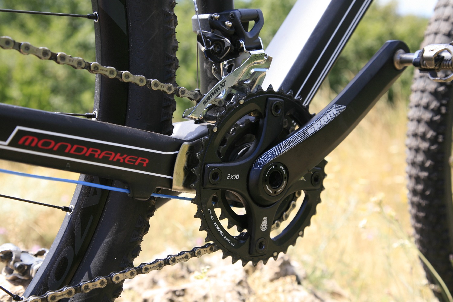 A 26-os Pro SL-nél az „SL” többnyire Sram X0 alkatrészeket, hátsó váltót jelent, Fox RL telót és kiváló Easton EA90 kerékszettet. Merev és könnyű gurigák! Ráadásul, lévén a szett tubeless kialakítású, hozzá passzoló tubeless Kenda gumik kerültek rá, amiért jár a háromszoros hip-hip-hurrá!!! Ritkán fordul elő, hogy gyárilag így szerelik a kerekeket, és nem házilag kell összerakni, vagy rögtön új gumit venni a belső nélküli rendszerhez. A Kenda Small Block Eight 1.95 DTC Tubeless külsők egyébként remek választásnak is bizonyultak a kánikulában keményre száradó poros ösvényekre. Remekül tapadnak, szerintem csak sáros, ragadósabb talajon nyújtanának gyengébb teljesítményt. Tartsa meg a Mondraker a jó szokását, hogy Easton kerekekkel szereli az XC bringákat!
