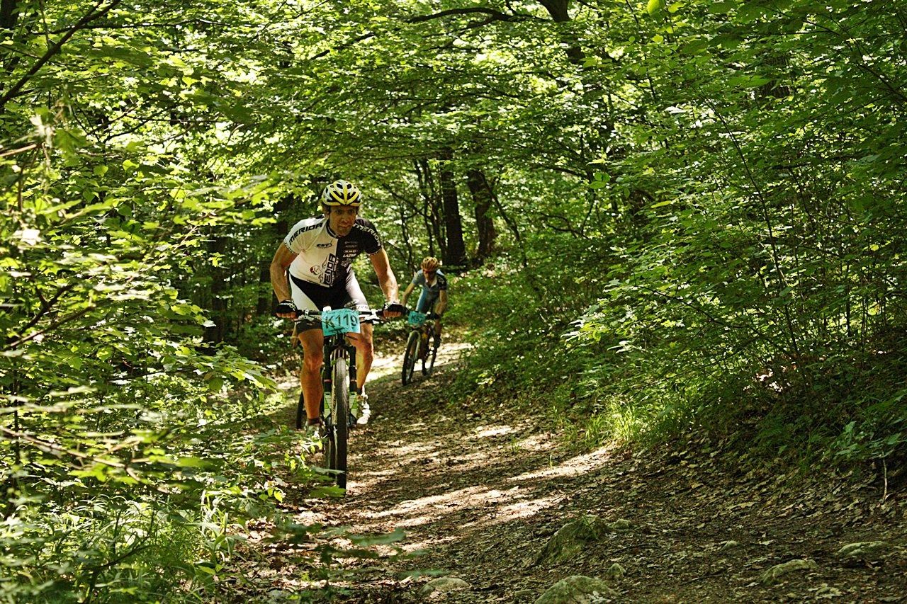Az utolsó lejtőre fordulva aztán kijött a 26-os előnye, Tánci szűken befúrta mellém a bringát belső íven, hogy elsőként kezdje az ereszkedést – na jó, csak viccelek, ez természetesen a rutinos BMX versenyzői múltnak köszönhető. Hozzáteszem, a hajtűkanyarba azért elég lomhán kanyarodott be a 29-es, emlékszem, a Vértesben még én csináltam meg majdnem ugyanezt a manővert 26-ossal a cél előtt. A lejtőn – hozzávéve a „forgalmat” – nem igazán lehetett előzni, ráadásul a fák között kígyózó csikicsukin hibáztam is, túl volt a bringa lendülete, csak szinte nullára fékezve sikerült menteni az egyik kanyart. Ezzel Tánci előnye pillanatok alatt lett vagy 100 méter, amivel meg is nyerte a versenyt.