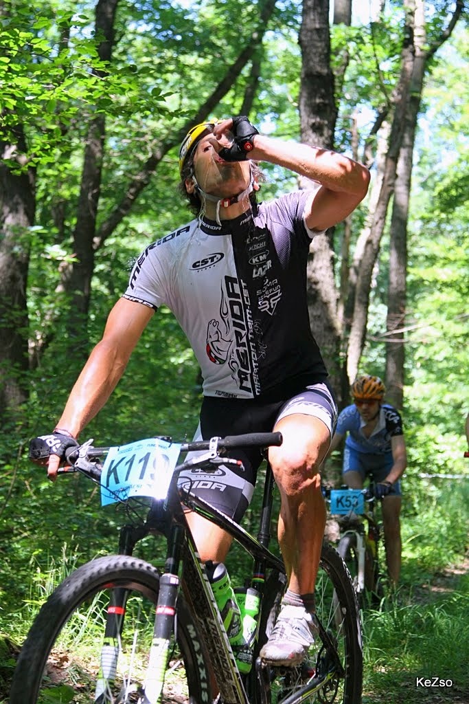 A gyakorlatban ez úgy nézett ki, hogy az első, nem túl meredek, köves talajú mászás során én kerültem némi előnybe, a nagykör első húzós mászás-sorozat közben viszont utolért Tánci és Hasenfratz Peti, utóbbi tempójából le is szakadtam a legnehezebb részen. A következő lejtő után azonban ismét látótávolságba kerültek, a dimbidombi szakaszon rendeztem magamban a sorokat és a hosszú, gyors lejtős részen mondhatni könnyedén felzárkóztam, s ebben biztosan szerepe volt a nagykeréknek.