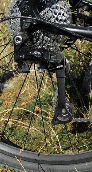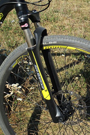 A villa a Suntour egy jobb trekking típusa, az NRX-D. Ez a típus már levegős, úgyhogy az állíthatósági tartománya rendkívül széles. A villa elfogadhatóan mozgott, de kicsit nehéz a megindulása, hiába játszottam a légnyomással. Talán majd ha bejáratódik. Merevségre a géphez mért felhasználási kör esetén nem volt gond. A lock-out kormányról vezérelhető, és a remote control kar a legjobb, legfinomabb volt, amit eddig valaha próbáltam beleértve a legnevesebb gyártókét is. A könnyű és strapabíró, szerényen megbújó vékony acél pánttal rögzülő kapcsoló szuperül kézre állt, nagyon finom mozdulattal lehetett mind be, mind pedig kikapcsolni, mégsem fordult elő véletlen kapcsolás a jól elhelyezett karok miatt. Ezt imádtam.