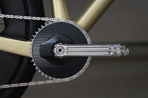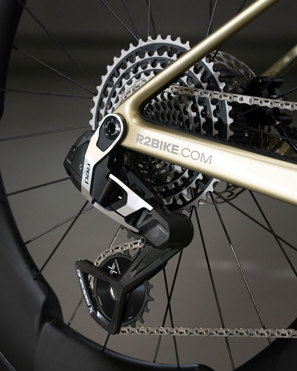 Hátul SRAM RED XPLR hátsó váltó dolgozik 13 fokozatú, 10-46‑os RED XPLR kazettával és RED lánccal, CeramicSpeed OSPW X ALPHA váltókanállal kiegészítve. Elöl a fő attrakció a WERT Cycling StW‑M titán hajtókar, 44 fogas SRAM RED Aero powermeter lánctányérral és CeramicSpeed BB ALPHA középrésszel, a rendszert Xpedo M‑Force 8 Ti pedálok zárják.