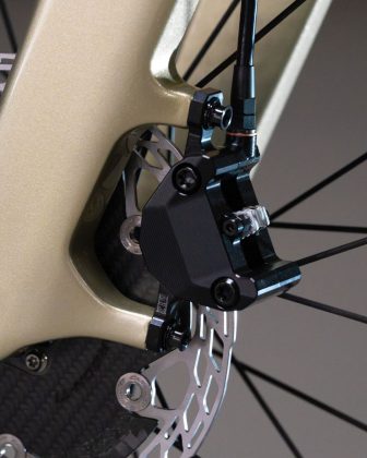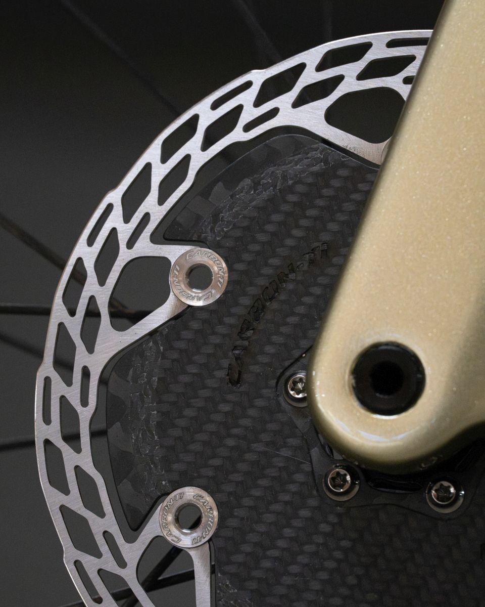 A fékerőt SRAM RED E1 fékkarok adják, a Hammerhead Karoo vezérléséhez használható „Bonus Buttons” gombokkal. A posztmount felfogatás miatt az építő nem akart adapterezett RED féknyergeket, így svájci 612 Parts kétdugattyús CNC féknyergek és 160 mm‑es, karbon csillagú Carbon‑Ti X‑Rotor Aero tárcsák kerültek a gépre.