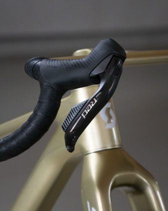 Elöl egy Darimo Nexum Drag Gravel integrált cockpit dolgozik 80×380 mm‑es méretben, –12 fokos stucnival, hogy a laposabb fejcsőszög ellenére is vízszintben álljon a kormány aero felső része. A headset, a kupak és a spacerek egyediek, így a kormány szépen „ráfolyik” a vázra, a kábelek pedig teljesen eltűnnek a frontból. Gustav a 183 centiméteres magasságához M‑es Scale Gravel vázat választott, így a drop‑bar ellenére nagyjából ugyanaz a pozíciója, mint L‑es Addict Graveljén.