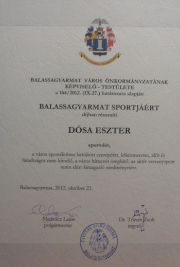 A következő program október 23-ára esett. Most kivételesen nem sportról volt szó, vagyis mégis, de csak áttételesen. Nagy meglepetésemre Balassagyarmat Önkormányzata a Balassagyarmat Sportjáért Díjban részesített, amelynek átadására délután került sor. A kis zenés műsorral színesített ünnepségen a szakmai díjak átadása mellett több fiatal Jó Tanulót, Jó Sportolót is díjaztak, többek között csapattársamat Pannát!
