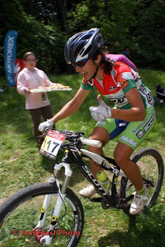 A kigyorsítást követően nem álltam vissza az addigi tempómra, hanem megpróbáltam kicsit meghúzni az emelkedőt, annak tudatában, hogy lefelé óvatosabban fogok menni, mint általában. Az első hosszabb lejtőnél a mély avar rejtegetett is számunkra egy-két meglepetést. Egyébként annyi embert az út szálén, mint ezen a maratonon, még sosem láttam – különösen élesek errefelé a kövek. Sajnos Gabinak is ez lett a veszte. Ez, persze, csak a célban derült ki, addig abban a hiszemben tekertem, hogy kérlelhetetlenül a nyomomban van. Bánkútra érve pedig eddigi bringás karrierem legsportosabb frissítésében részesülhettem – köszönet érte Fenyvesi Tominak!