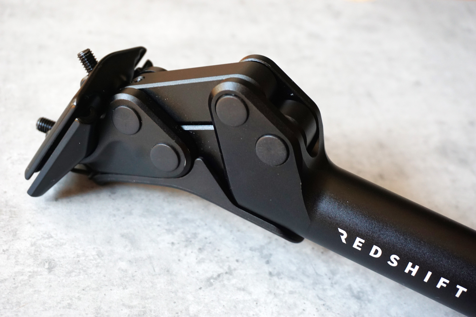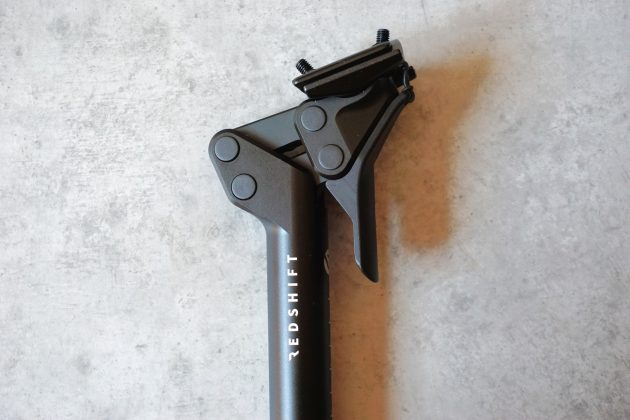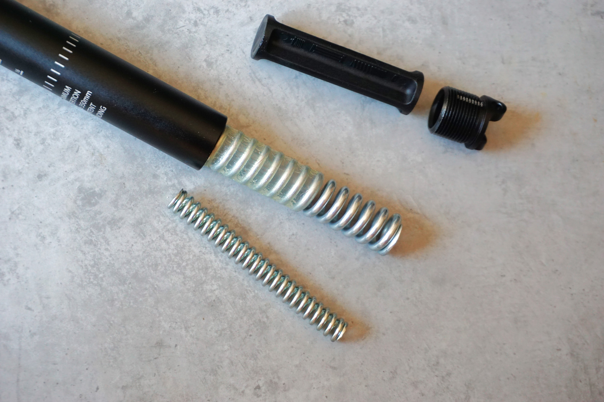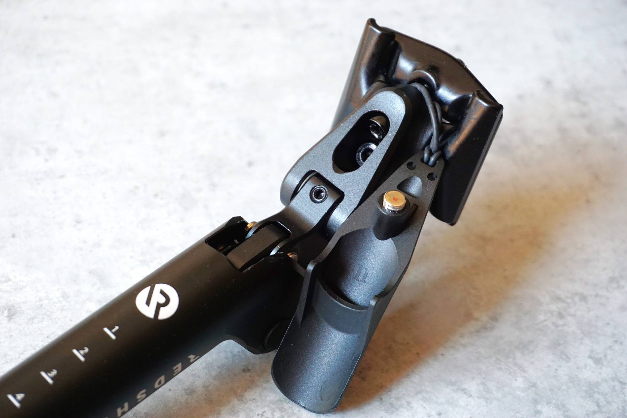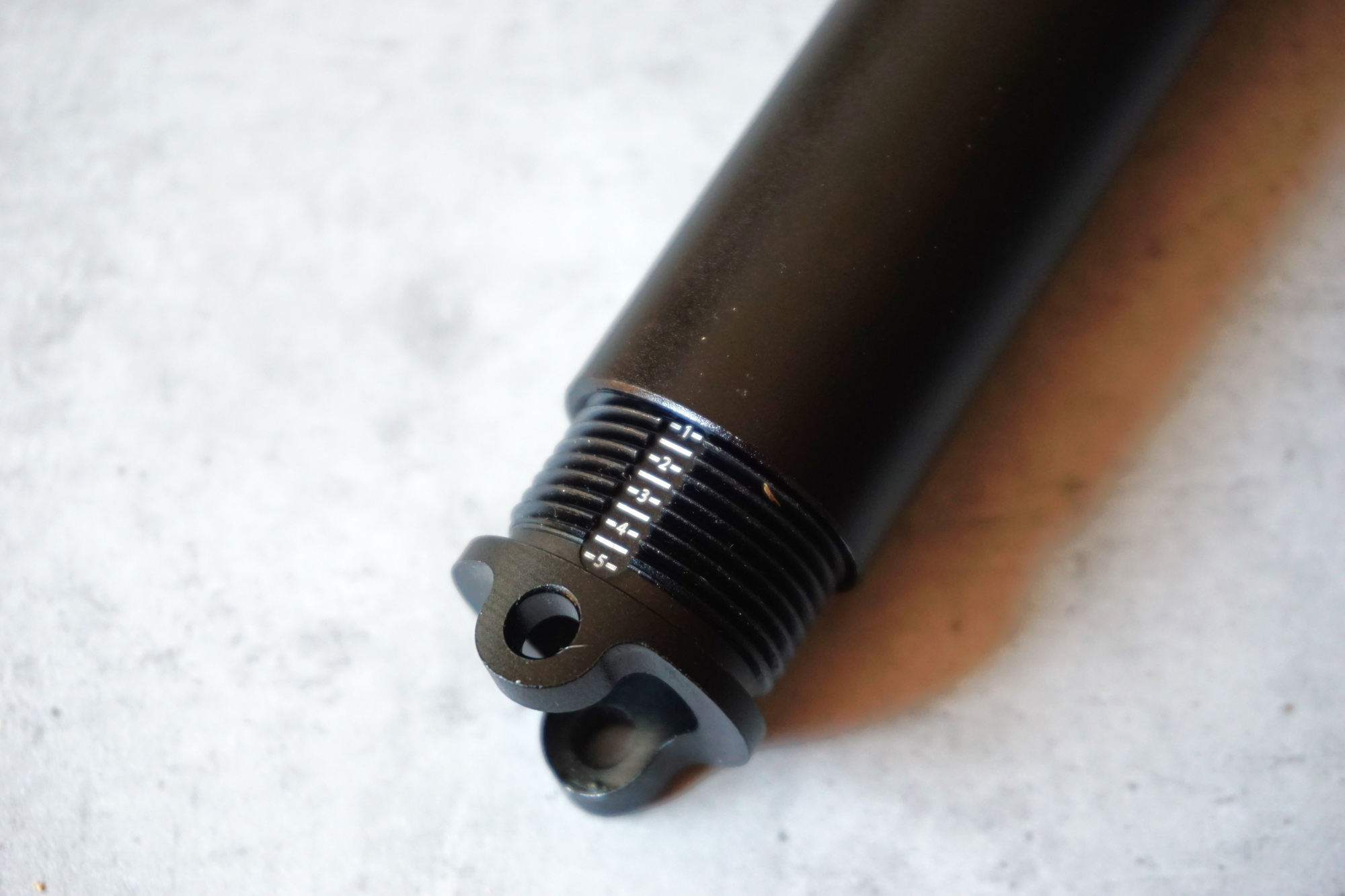 A ShockStop Suspension nyeregcső egy normál karbon nyeregcsőhöz képest jóval nehezebb, 27,2×350 méretben mindennel együtt 574 grammot mutatott alatta a mérlegem, a kisebbik rugó nélkül 551 gramm. A hozzám érkezett Endurance modell a gyártó adatai szerint 35 mm mozgásra képes és ez nem csak egy fel-le mozgás, hanem egy ívben mozog le és hátra. Ezt több forgáspont segítségével teszi meg, élőben látszik, hogy nagyon igényes darab. A hátulján található egy mágneses porvédő műanyag ami megakadályozza, hogy a hátsó kerékről közvetlenül rákerüljön a kosz. A rugóútját egyébként bárhogy mértem, nekem csak 28 mm jött ki. A nyeregcső belsejében található egy acélrugó (+ egy kiegészítő rugó), amit a testsúlyunknak és stílusunknak megfelelően tudunk előfeszíteni, ezáltal állítani a keménységét. Szintén van gyári ajánlás rá, hogy mekkora testsúlyhoz hányat fordítsunk a nyeregcső alján található kupakon, illetve mekkora súlyhoz ajánlják a kiegészítő rugót. Mivel nem vagyok pillesúlyú alám már kellett a plusz rugó.