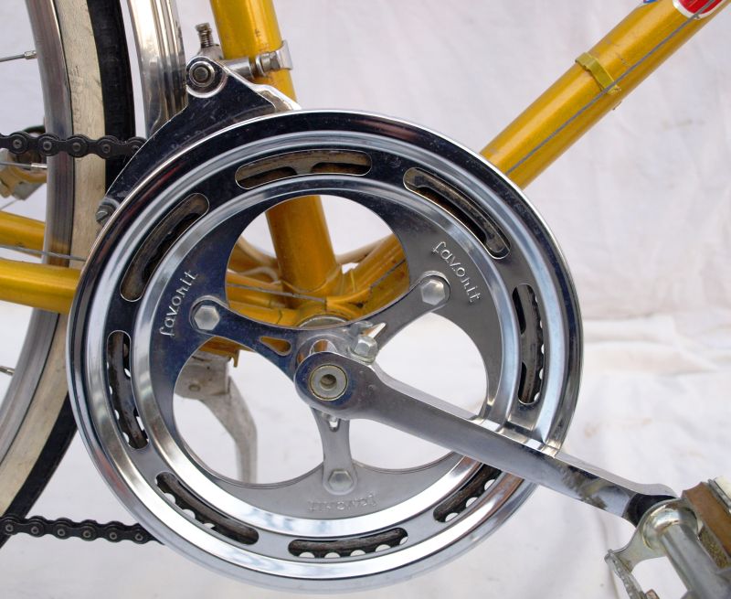 Majd megérkezett, a használat nyomai nem látszanak rajta, nincs racsni- vagy fékbetétkopás, csak tárolási nyomok, és az is szerencsére kevés. Nos, miről is van szó Favorit Special típusú (katalógus szerint az F10 családba tartozik), véleményem szerint gyönyörűen muffolt acél vázas kerékpár, nem lemez, hanem jelöletlen kovácsolt papuccsal, 58-as nyeregcső vázmérettel (csak ebben a méretben készült), 28-as kerékmérettel, 32×622-es gumimérettel, 2×5 fokozatos meghajtás, teljes felszereléssel, eredeti állapotban, eredeti gumikkal! Eredeti fényezése is különleges, a fém vázat alapozták (jelen esetben fehér színnel) majd a lakkréteget „színezték” meg, azaz nem színtelen, hanem jelen esetben világos-arany színű lakkal véglegesítették a fényezését. Ez olyan helyeken vehető észre, ahová a fényezés során több színezett lakk került, ugyanis ott sötétebb árnyalatú lett a végeredmény.