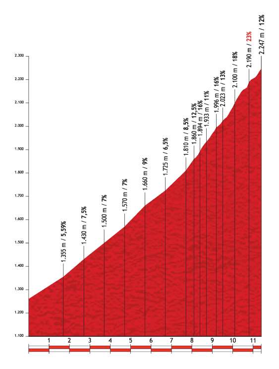Előtte még két első kategóriás hegyet kellett abszolválni a végletekig elcsigázott mezőnynek: a Puerto de la Morcuera 9.2 km és 6.9%, a Puerto de Cotos 13.8km és 4.9% átlagmeredekségű, illetve több kisebbet, amelyen valamennyi hegyi pontot még lehetett szerezni. Az összetett elsőségért folyó harcot pedig a Bola del Mundón kellett megvívni a spanyol triónak.