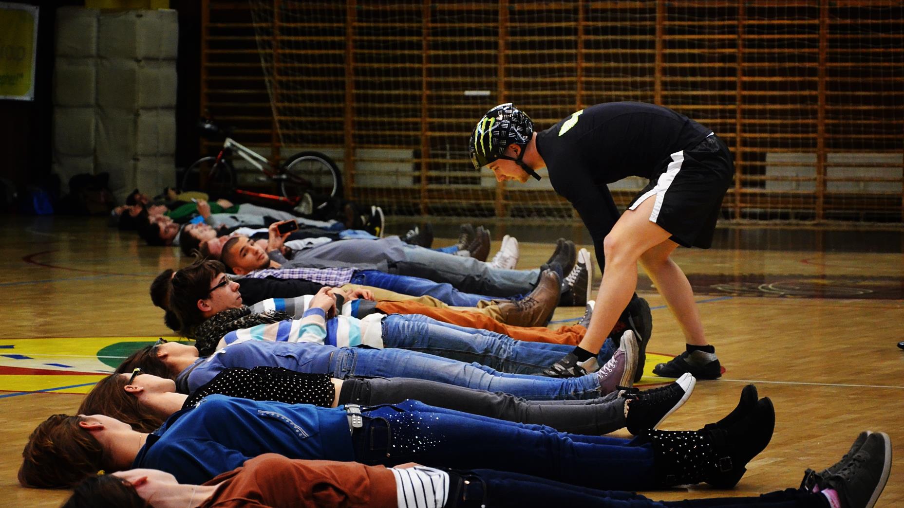 Bár Hegétől sok minden kitelik, de az 32 embert nem egyszerre repülte át, hanem a 25 önként jelentkező egymástól több mint fél méter távolságban feküdt mozdulatlanul, és folyamatosan, hátsó keréken pattogva kellett abszolválni az „élő akadályokat”, a 25 ember átugrása után „fordítóval”. (A korábbi rekord 30 ember volt hasonló módon.)
