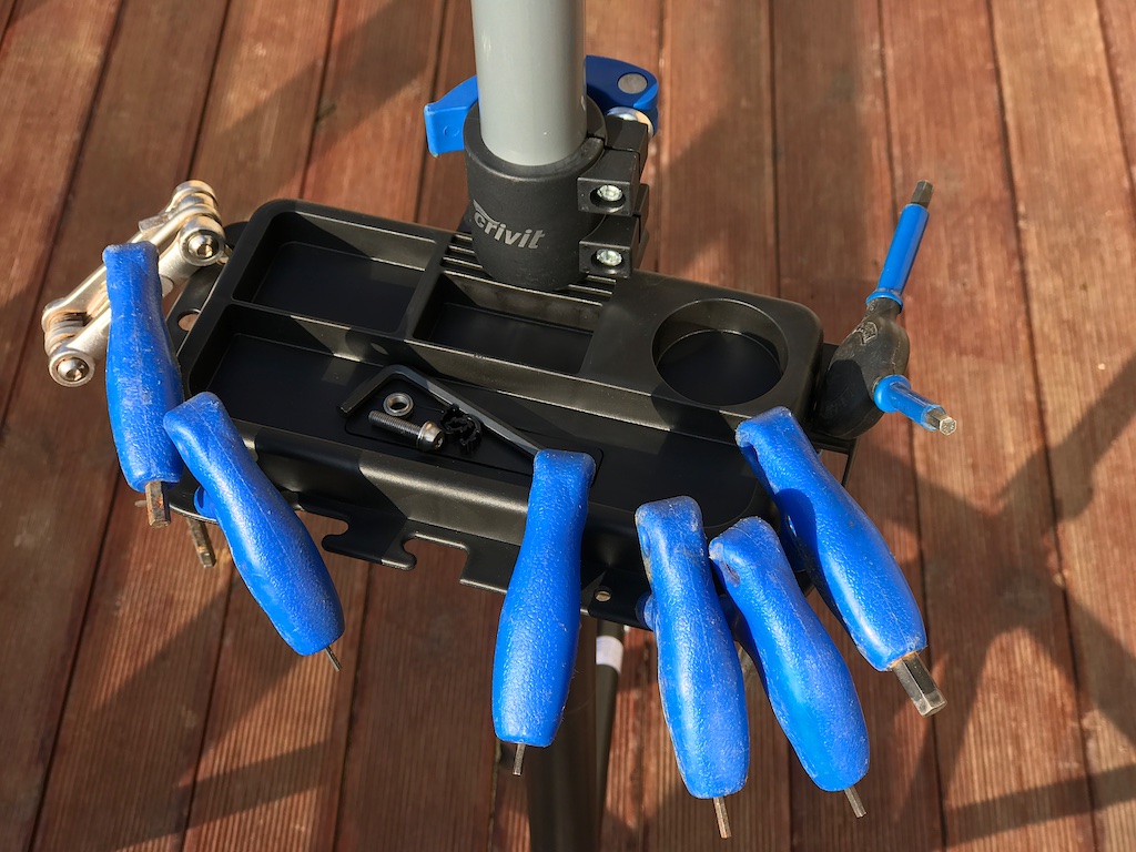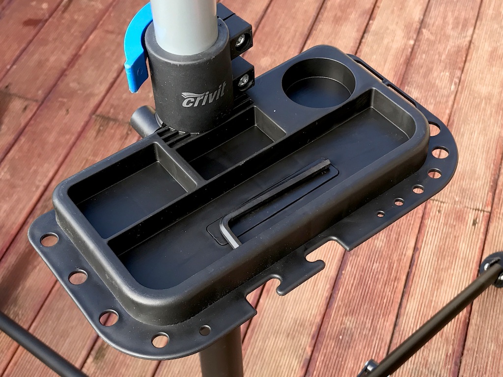 Jár hozzá egy szerszámtartó tálca, középen mágneses csíkkal, így a csavarok sem gurulnak szanaszét, bár két kisebb mélyedést is találunk rajta, ahová szintén be lehet az apróságokat rakni. A tálca peremén kis lyukakat találsz, amibe az imbuszkulcsokat be lehet dugni. Ez szerelés közben nagyon praktikus.