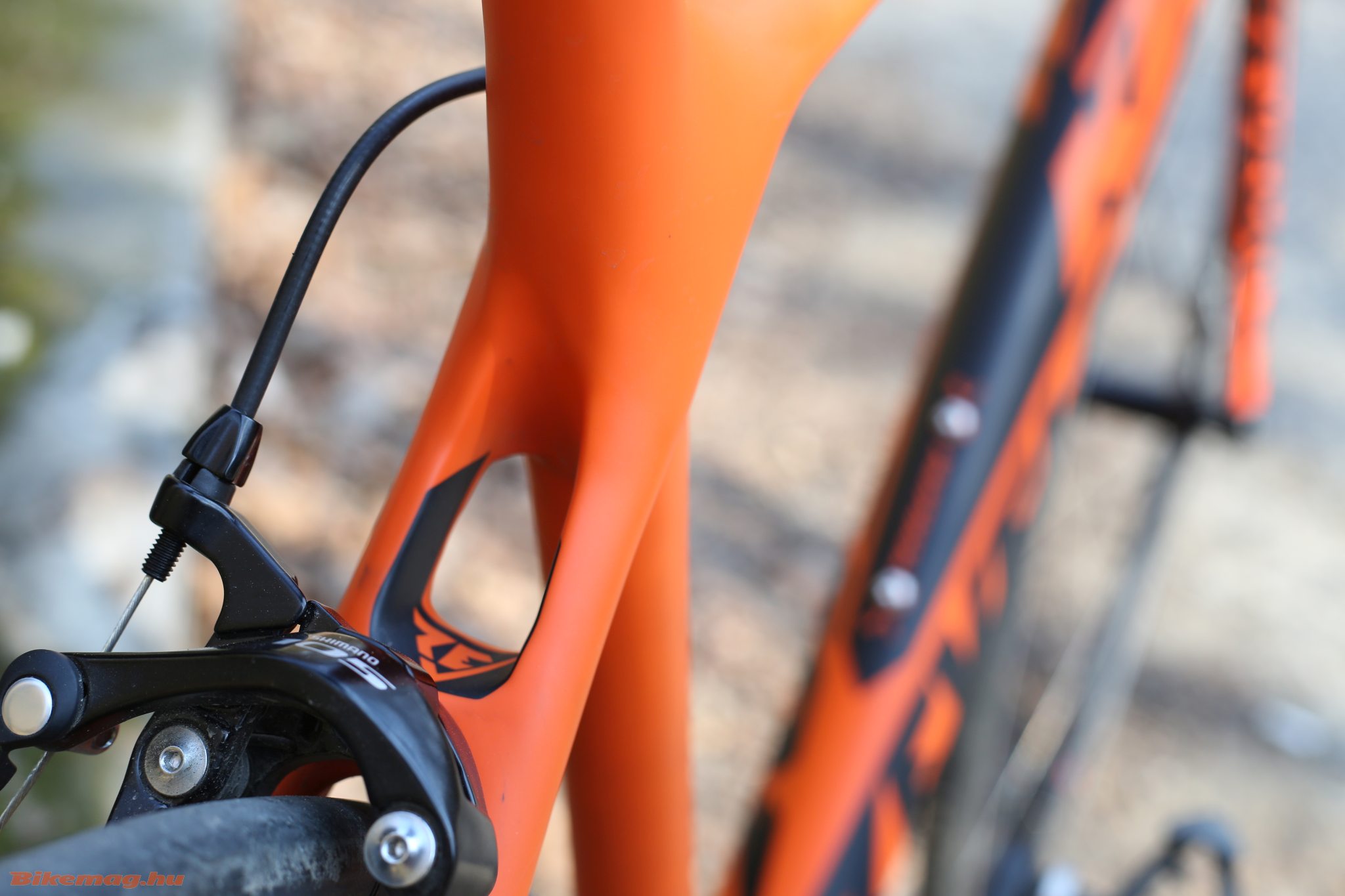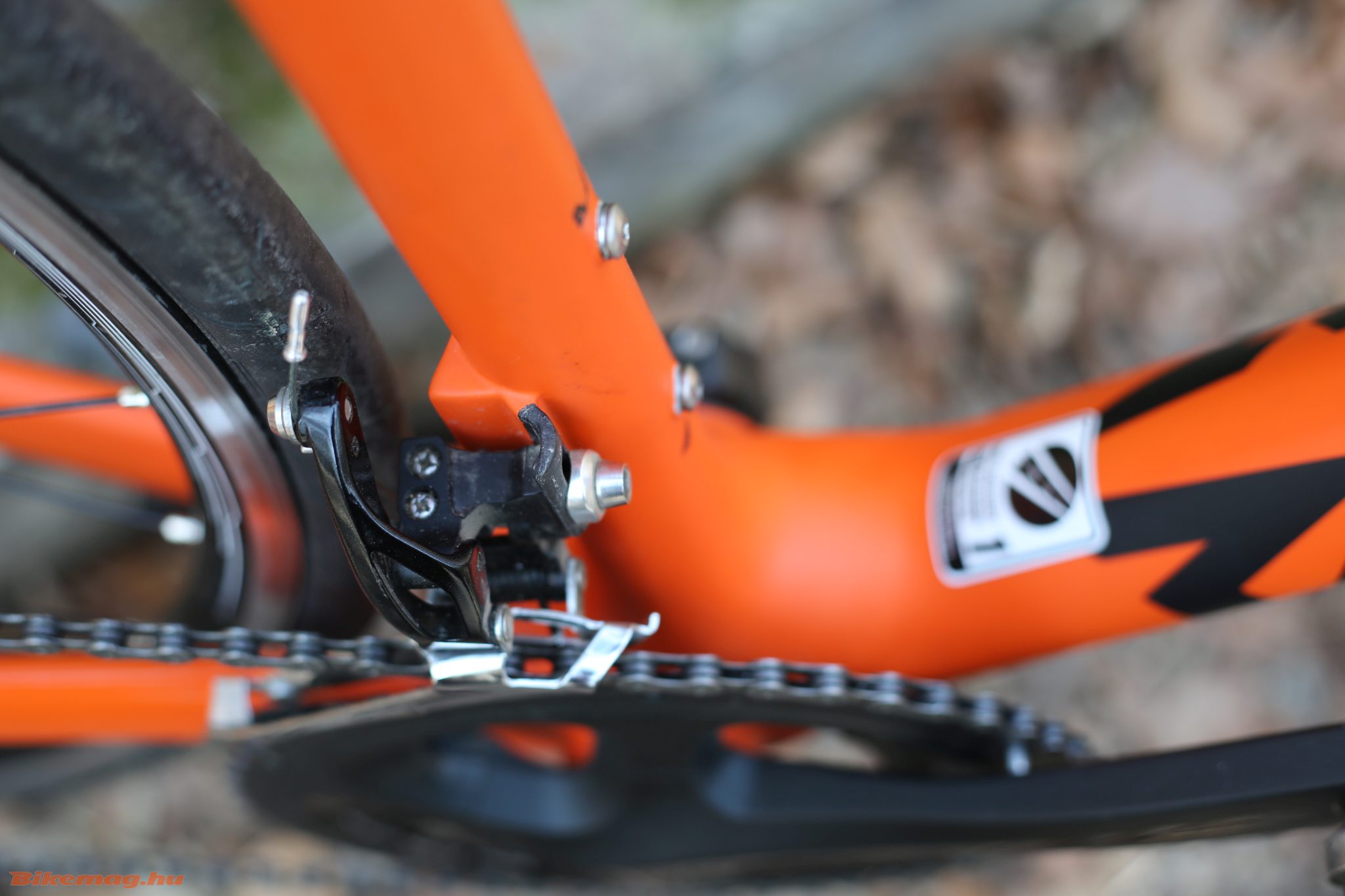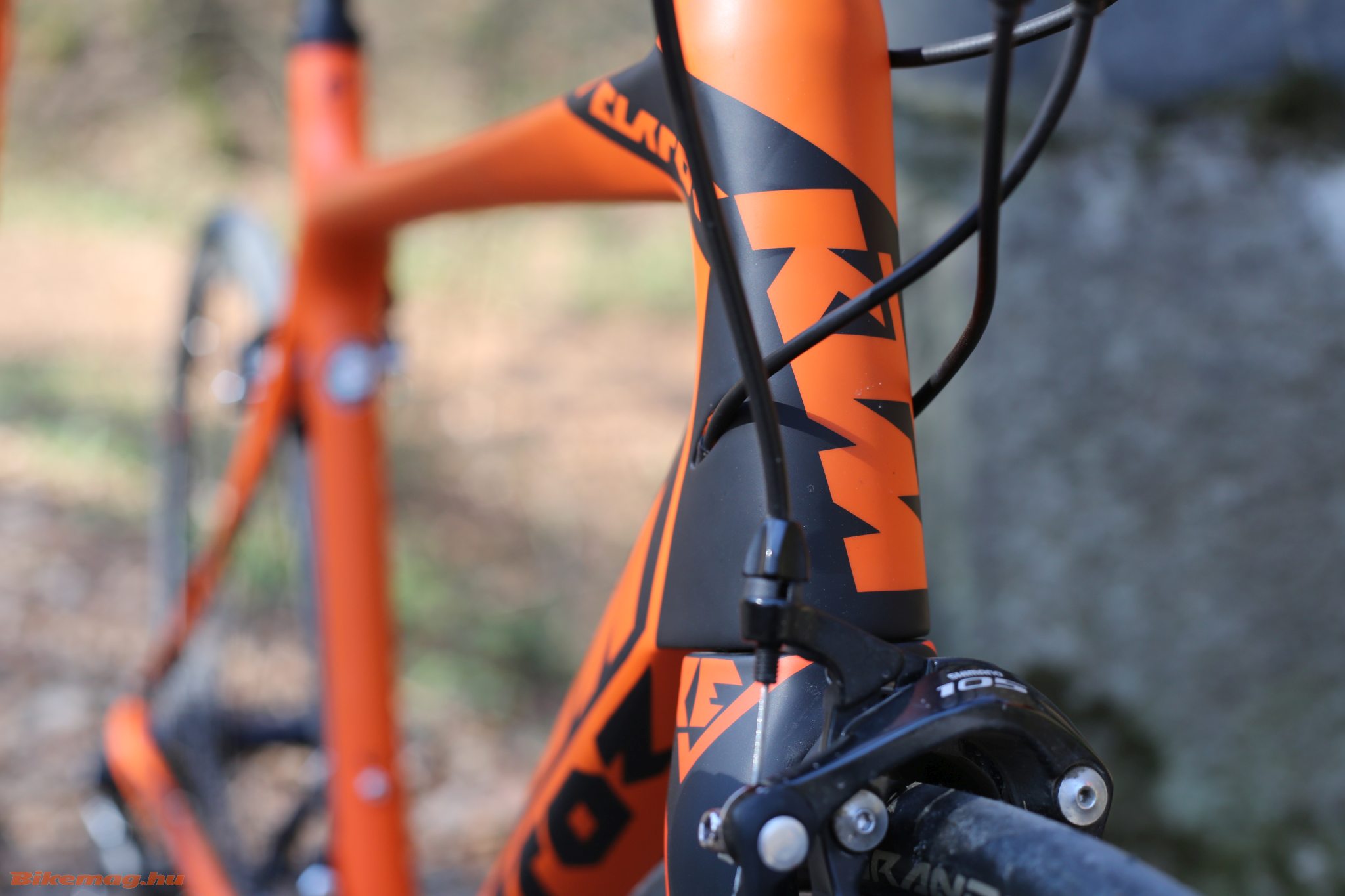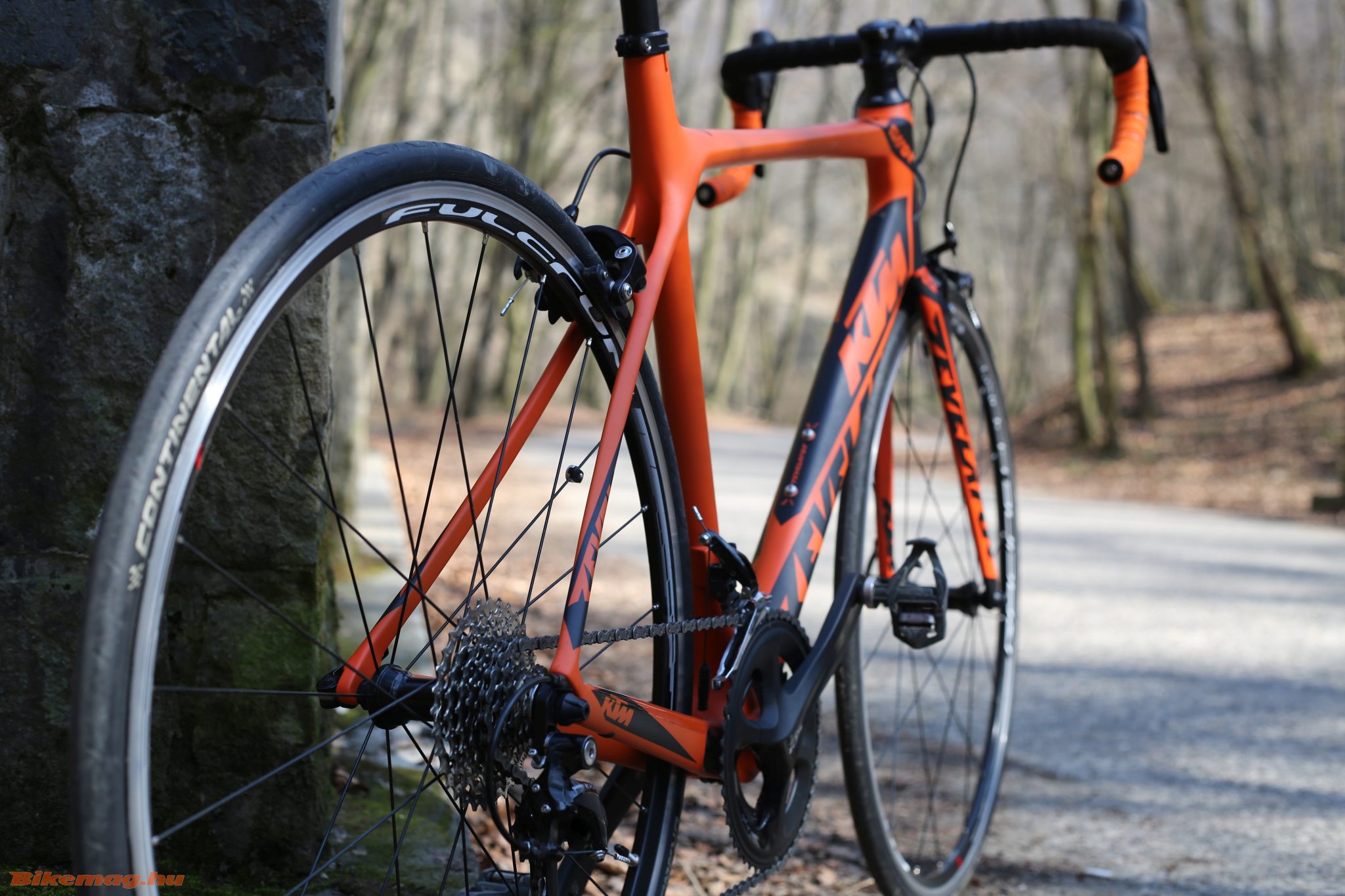 A KTM sosem trükközött az alkatrészcsaládok keverésével (sőt ez általában igaz az osztrák-német bringagyártókra), itt is színtiszta 11 sebességes 105-ös szettet találunk. A hajtómű 50×34-es kompakt tányérokkal van felszerelve, amihez hátul 11-32-es sort illesztettek. Egyszerűen nem értem miért kell ezeket a csúnya „monti” sorokat felrakni kompakt hajtóművekhez. A hazai „hegyek” között nincsen rá szükség még átlagos erőnlét esetén sem, persze ha a Zoncolan-ra vagy a Stelvio-ra készülsz, akkor már jól jöhet.