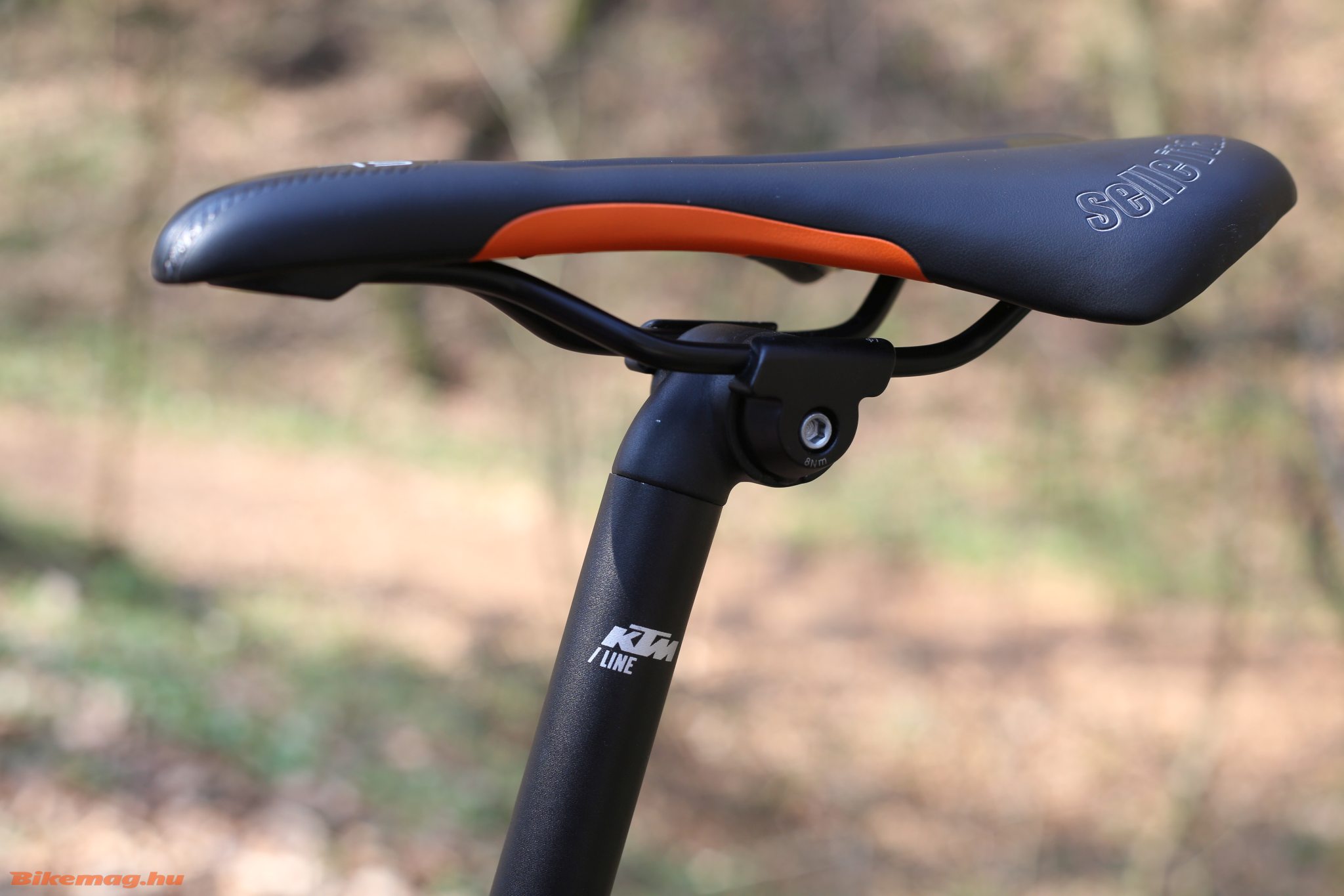 A kormány/stucni/nyeregcső kombó KTM névre hallgat, jobban szerettem régen a Ritchey cuccokat, de gond ezekkel sem volt, a merevségük is megfelelő, de a súlyukat azért szívesen lemérném. A Selle Italia SL Flow nyereg baromi kényelmes, de ez ugye fenékfüggő, nem biztos, hogy mindenkinek ugyanez lesz a tapasztalata. Nekem több órás bringázások alatt is komfortos volt, könnyű rajta helyezkedni is a kanyarokban.