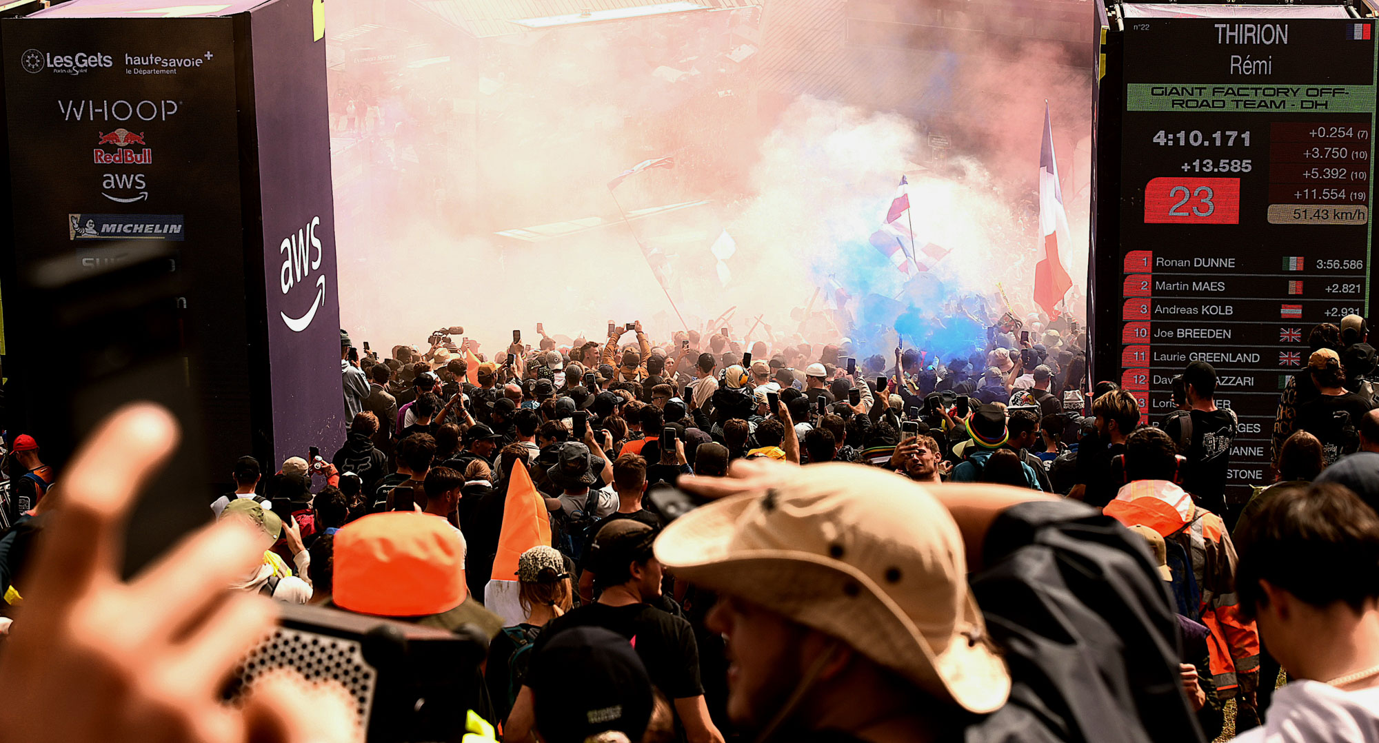 A verseny napján a helyzet változatlanul reménytelen. Egész estés esőzés, ami nem maradt abba reggel sem. Itt már nem csak a versenyzők, a fotósok és videósok is csúsztak – másztak. Meg persze a nézők is. Délutánra napos időt írtak, így a mindenféle motoros fűrésszel felvértezett tömeg hirtelen nagyon megszaporodott. Tavaly is sokkal nagyobb tömeg gyűlt össze Les Gets-ben, mint bárhol máshol a rossz idő ellenére is. Én jómagam, még ennyi embert MTB versenyen sosem láttam. A tömeg látványának magasztossága mellet, némi félelem is körbe lebegett minket. Bár a tavalyi incidensből tanulva, idén dupla kordon fal védett minket és a versenyzőket. Roham rendőrség, lovas osztag ismét felvonult.