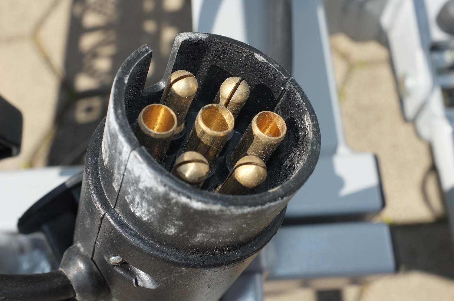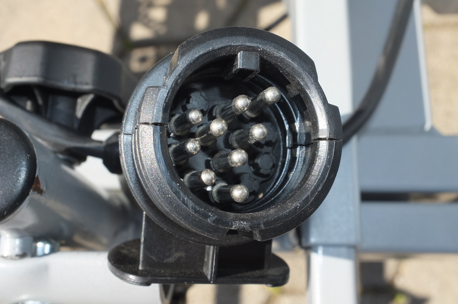 Szintén 7/13 pines csatlakozó jár hozzá, de megfejelték azzal hogy magán a tartón van egy „lyuk” ahová leszedés után be lehet dugni, így nem fordulhat elő hogy lerakod a betonra és pont a kábelre vagy a csatlakozóra ejted rá. Apró, de nekem lényeges figyelmesség. Sajnos a tolató és ködlámpa csak a 13 tüskés csatlakozó esetében működik, így régi autókon ezek a plusz funkciók kimaradnak.