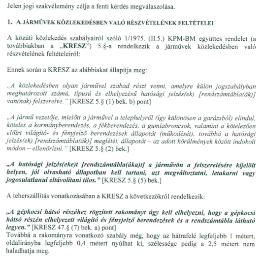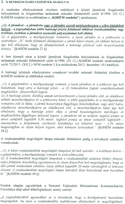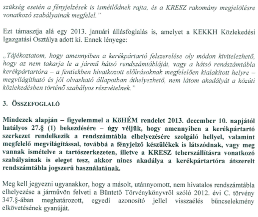 Szót kell ejtenünk a hazai szabályozásról is! Itthon CSAK és KIZÁRÓLAG AKKOR szabályos a kerékpár szállítása, ha nem takarja ki EGYÁLTALÁN (tehát nem kicsit meg nagyon hanem 0%-ban) sem a rendszámtáblát, sem a lámpákat! Az autó EREDETI rendszáma (semmilyen utángyártott, „copy”, „másolat” feliratos, ez ugyanis okirathamisítás) átrakható a kerékpárszállítóra, amennyiben azon „E” jelzésű rendszám megvilágítás található, illetve amennyiben az autók lámpája ki van takarva, fék, index, helyzetjelző lámpáknak a tartón is lennie kell.