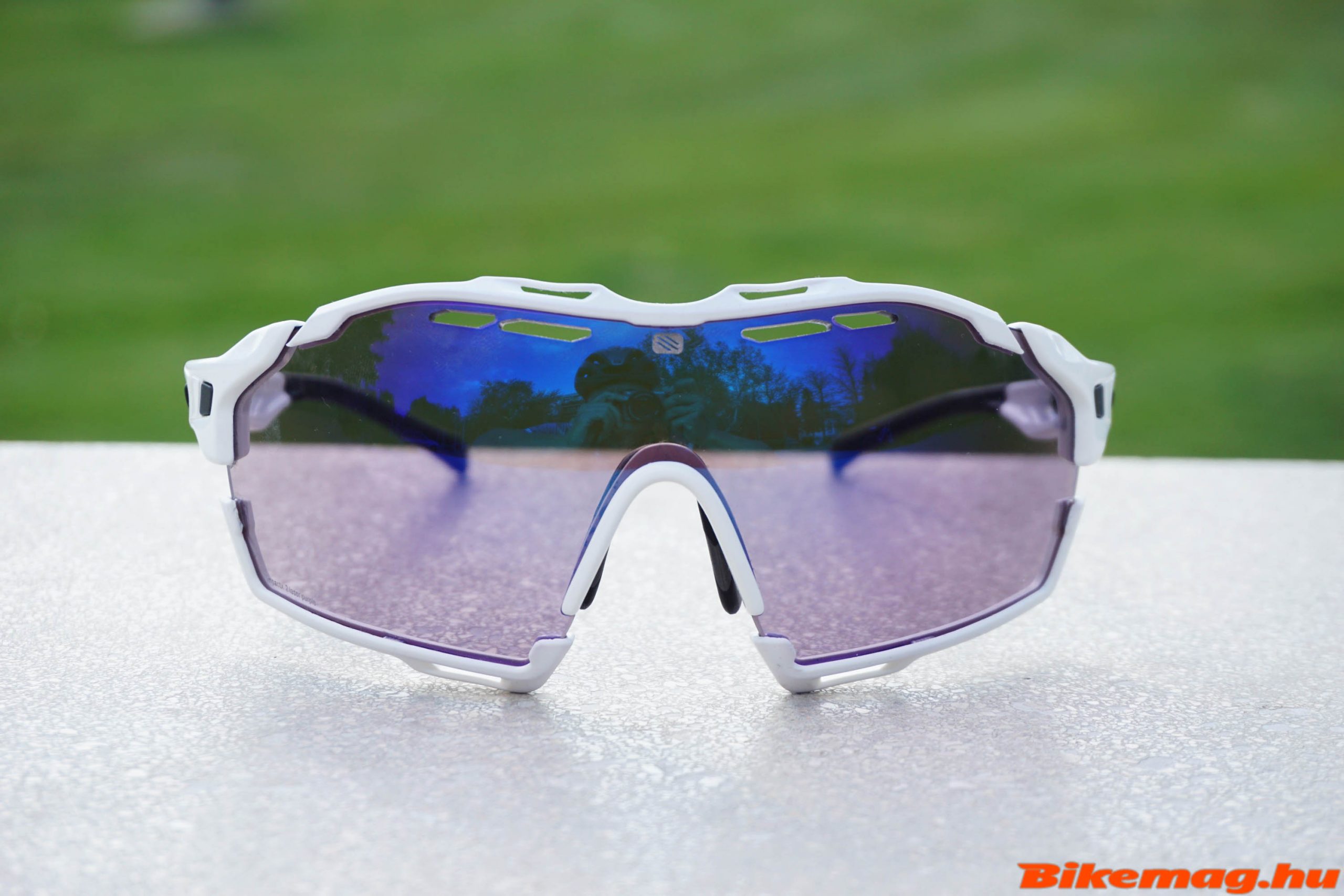 A Cutline további érdekessége, hogy elérhető az impactx2 laser purple lencsével is, ami a Rudy Project legújabb fotokromatikus lencséje. A lilás árnyalatú fényre sötétedő lencse alapállapotban is sötét, a fény 48%-át engedi át, míg teljes fényben mindösszesen csak 8%-ot enged át. Eredetileg golfozóknak fejlesztették, de hamar rájöttek, hogy más sportokban is használható, ahol hasznos a zöld és kék színek kontrasztosítása, mint például kerékpározáskor. A tapasztalataink szerint bringán is nagyon jól használható, én például kifejezetten szerettem, erdőben is láttam még vele rendesen és naplementekor is még elég volt nekem az 50% körüli fényáteresztés. A tavaszi erős fényben sem vallott kudarcot, bár a mulitlaser lencsék a papíron magasabb fényáteresztési értékükkel mégis nagyobb sötétséget biztosítottak, de az impactx2 laser purple lencsével sem akartam megvakulni a fénytől. És ami még mindenképpen mellette szól, hogy tényleg nagyon szép képet ad ez a lencse, a zöld és kék színek tényleg látványosan szebbek.