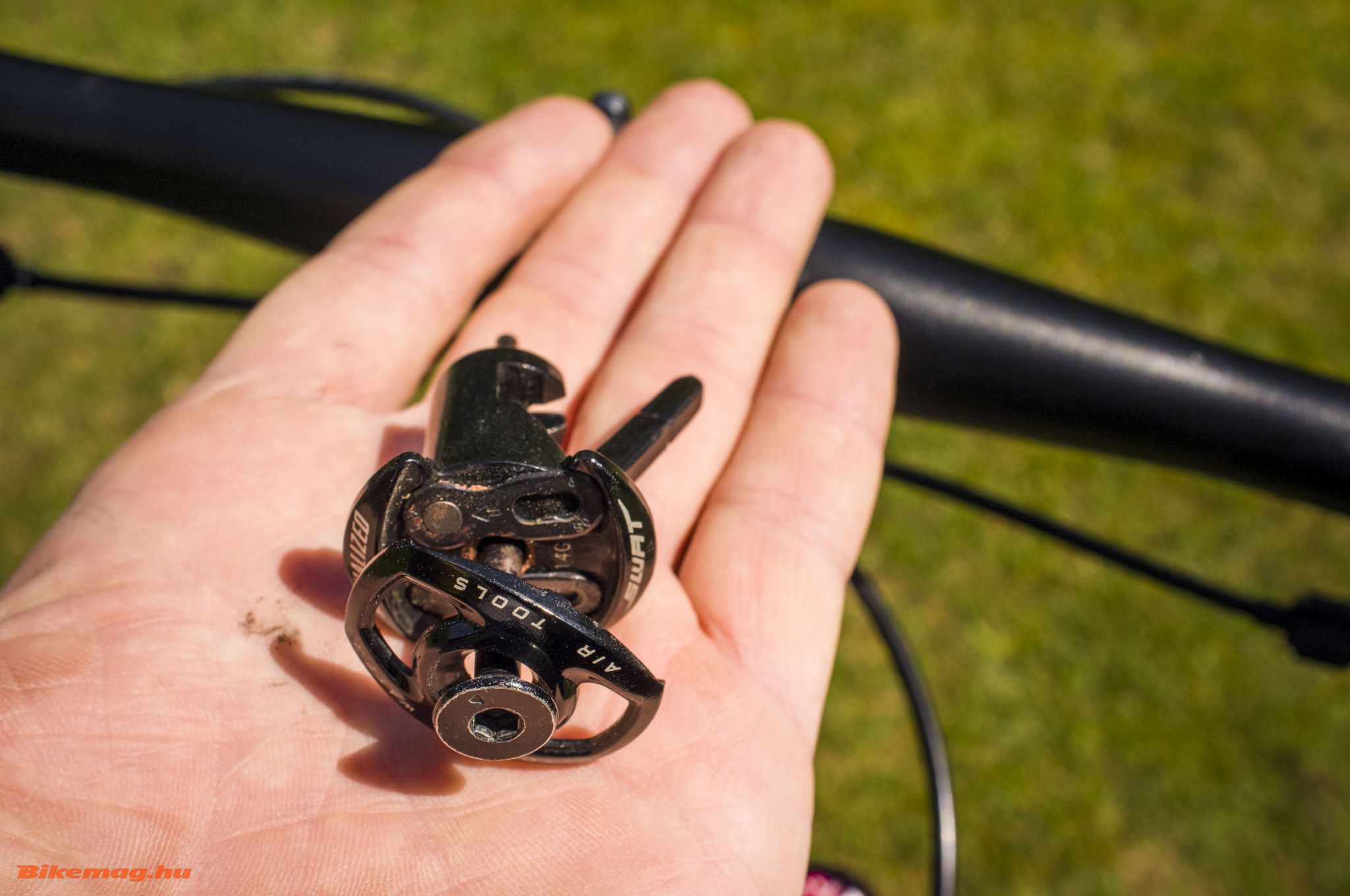 Nagyon jó, hogy a kis boxba pont befér egy pótgumi, egy patron fejjel és egy gumileszedő, vagy egy pótgumi-leszedő- multiszerszám kombináció. Én csak versenyre teszek be patront, amúgy elég a pumpa, maratonon pedig úgyis jobb, ha a szerszám kéznél van a zsebben. Fontos, hogy bármit teszünk bele, zsúfoltság legyen bent, különben csörögni, zörögni kezd majd terepen, ami csörögni, zörögni tud. A láncbontót egyszer elpróbáltam, hogy működik, több idő piszmogni vele, mint egy rendes szerszámmal, élesben még nem kellett használni. Mellesleg amióta belső nélkülire alakítottam a kereket, a pótgumihoz sem kellett hozzányúlni.