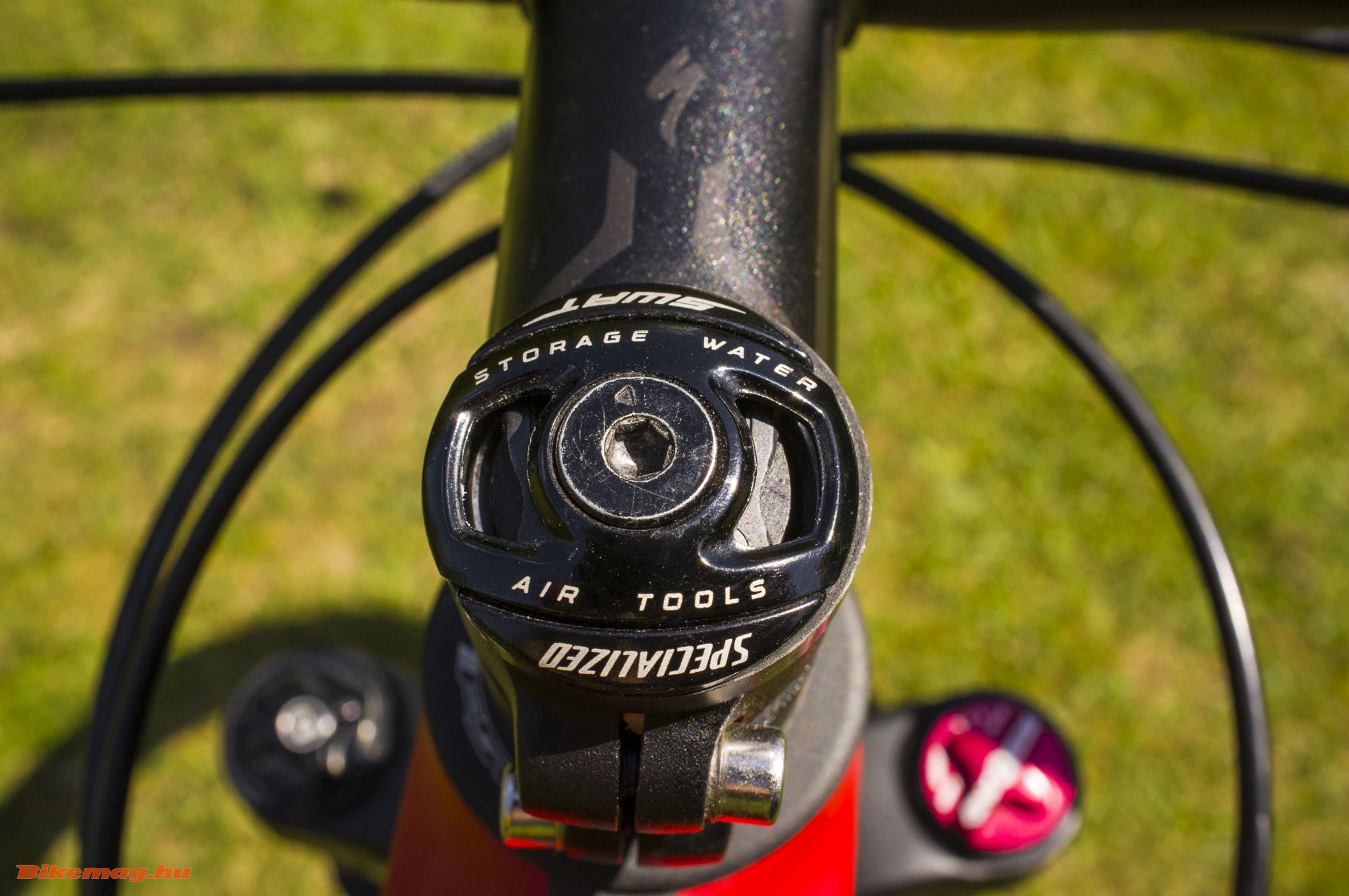 A Brain tulajdonképpen csak egy plusz szelep a villában és a szár alsó részén állíthatod be, hogy mekkora erőnél nyisson. Ha a maximum mögé tekered kicsivel, nem tévedhetsz nagyot. Érdekesség, hogy a csillapítás gyorsaságát állító csavar felköltözött a villavállra. Ezeket a telókat egyébként kizárólag a Specialized számára készíti a Rock Shox, különlegességük még, hogy „csak” 90 mm úton mozognak. A 100 mm-hez képest észre sem veszed a különbséget.