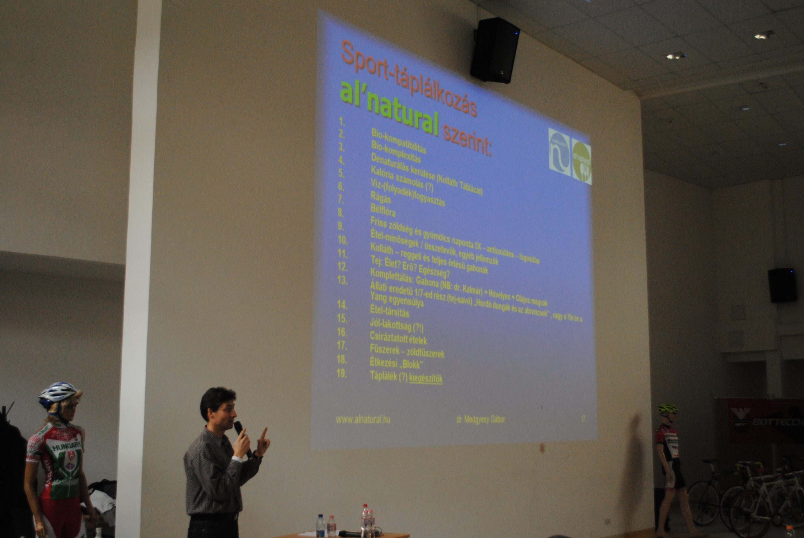 Kis szünetet követően Dr. Medgyesy Gábor előadásával folytatódott a program. A sebész orvos eleinte saját baráti körét igyekezte rábírni a helyes táplálkozásra, ma pedig már többek között Kusztor Pétert és más sportolókat lát el dietetikai tanácsokkal. Világos és tényekkel alátámasztott érvrendszere rendkívül meggyőző és tanulságos volt, előadásából azonban – köszönhetően a rendkívül nagy érdeklődésnek – vajmi „keveset” láthattunk csak (ígéretet kaptunk a prezentációk közzétételére).