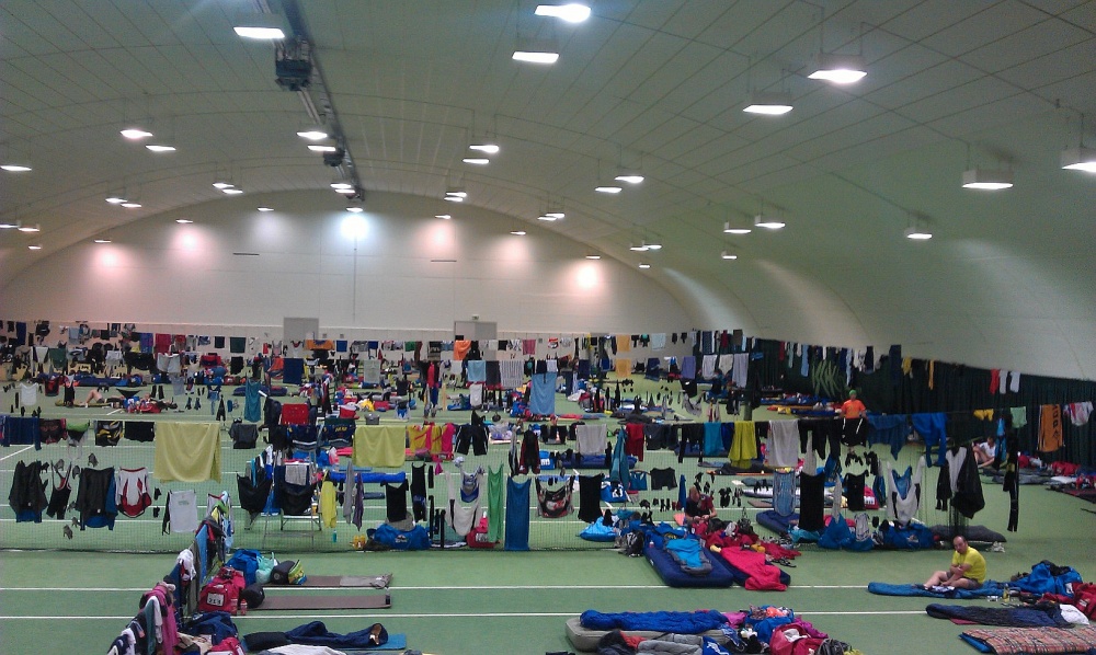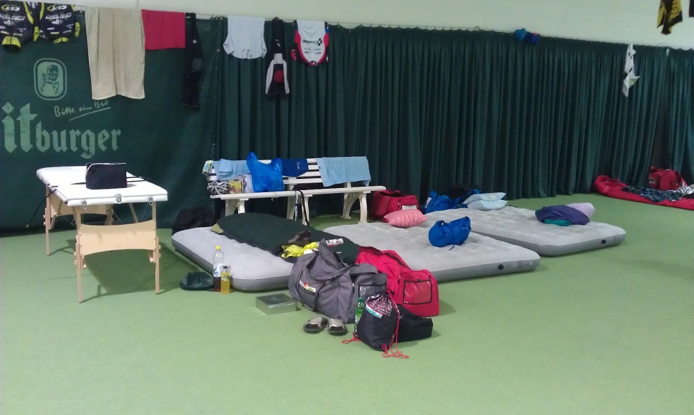 Míg a srácok a rajtnál várakoztak, addig én elindultam Ischgl-be. Ma már okosabb voltam, így 10 óra előtt már a célállomáson voltam, felállítva szerény kis bázisunkat. Ma egy négypályás teniszcsarnokban kaptunk helyet. Még nem voltam ilyen helyzetben, de most már el tudom képzelni, milyen lehet egy menekülttábor! J Mindamellett eddig ez tetszik a legjobban idáig és ezzel a fiúk is egyetértenek. Ettől kezdve volt időm elkampajogni a településen, körbe tudtam nézni, hova jelölték ki a szervezők a bringamosót, hol lesz a pasta party, hogy mire beérnek versenyzőink, teljes körű információval tudjak szolgálni. Ezek után teljes megelégedéssel vártam őket a célban.
