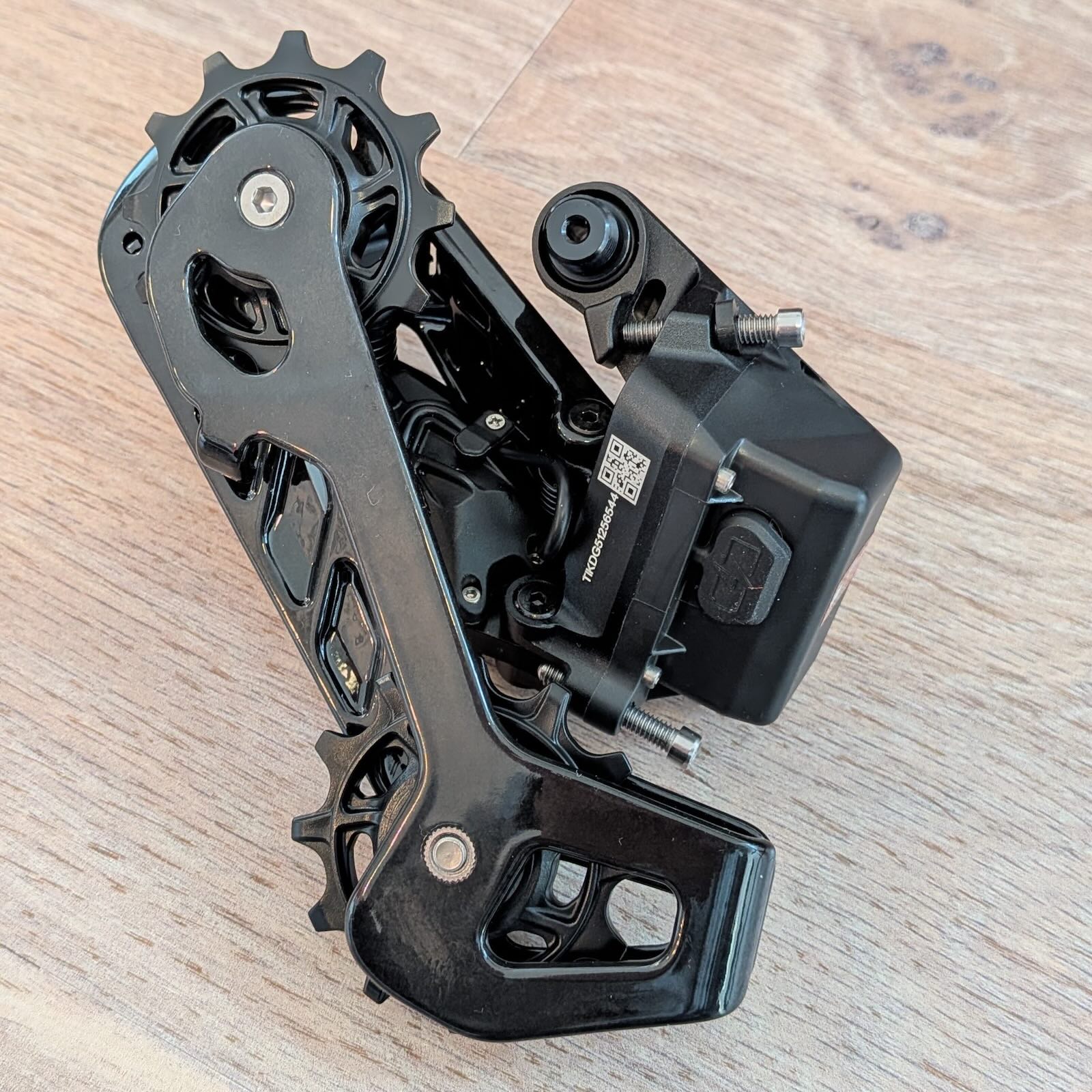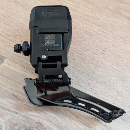 Az első váltó kevésbé izgalmas, itt nem használtak karbont, csak egy műanyag házban van felül az akku és a motor. A terelőlemezek feketék, de a váltó nem kapott műanyag betétet a Shimanokkal ellentétben. A töltőcsatlakozások fedele mindkét váltónál gumival védett. Ezek nem túl masszívak, mindenképpen vigyázni kell majd rájuk.