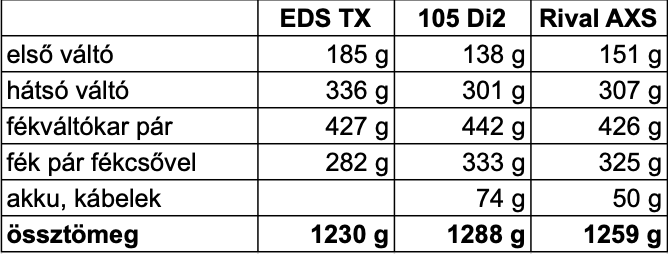 Az EDS TX-et értelemszerűen itt is a 105 Di2 és a Rival AXS-hez hasonlítottam. Az alkatrészeket megmértem, és igyekeztem a másik két szettről hitelesnek tűnő forrásokat találni. A mérések alapján az EDS TX a legkönnyebb, de a három szett nagyon közel van egymáshoz.