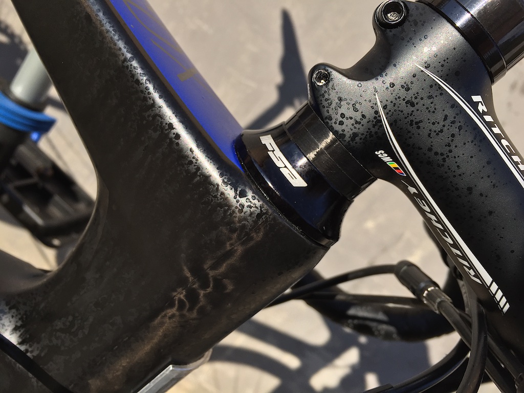 Végül de nem utolsó sorban itt a Cleaner ami pumpás működésű tisztítószer. Lecsapatod a sarat, koszt a bringáról slaggal, aztán jöhet a Cleaner, aminek összetételében nem találtam nyomát szilikon származéknak, de tény, hogy visszaadja a „fényét” a matt festésű vázaknak is. Akinek ilyen bringája van az tudja, hogy hiába mossa le alaposan, száradás után borzalmasan néz ki és utólagos „fényezőszer” kell hozzá. A Cleaner megoldja ezt, aminek külön örültem, mert havi néha tucatnyi tesztbringát kell gatyába ráznom visszavitel előtt és megspórolt nekem egy újabb kört. Egy valamire kell vigyázni. Meleg, napos időben hamar szárad a vázon és főleg a matt illetve selyemfényű vázak esetén csúnya foltokat hagy, amit nem tudsz szárazon eltüntetni, csak ha újra fújsz rá a Cleanerből.