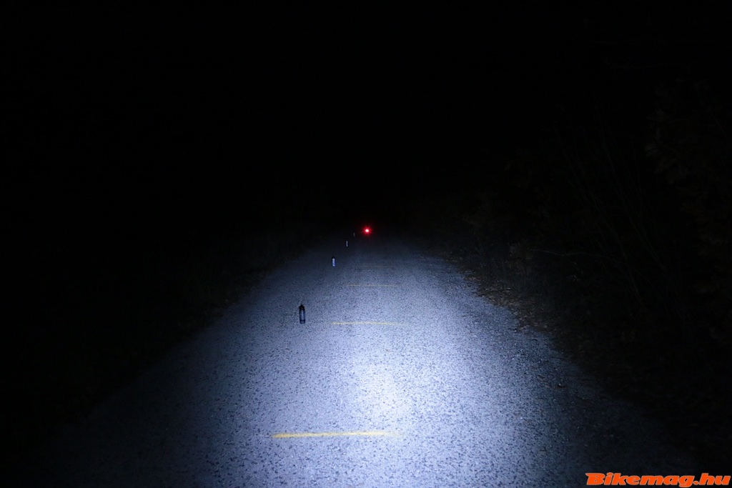 Kis méretű, könnyű lámpa, cserélhető akkumulátorral, így tartalékot is tehetsz a mezzsebbe vagy táskába. Méretét fénye meghazudtolja, 50 méterre is látsz vele a tök sötétben, de a megvilágítás kevésbé homogén. A fotón is látható egy fényesebb középső pászma, alatta egy sötétebb sáv, majd egy kevésbé megvilágított, de egyenletesen szórt terület. Ellenben már a bringa elé közvetlenül is világít, amit sajnos sok lámpa nem tud. Részletesen itt olvashatsz a BBB Strike 300-ról!