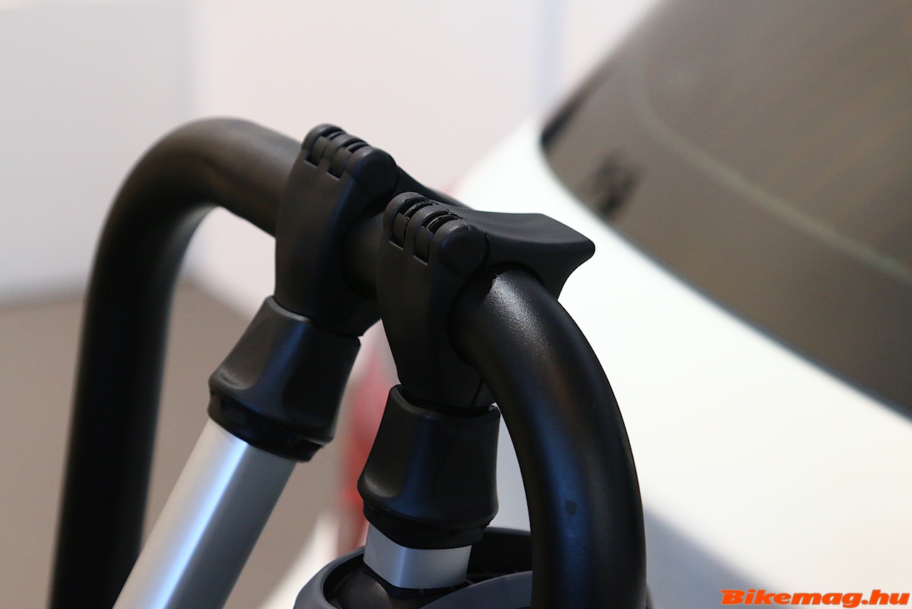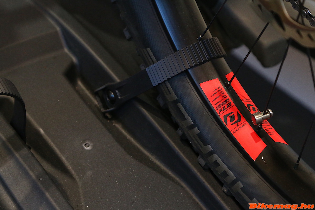 A Thule Easy Fold XT sínje úgy lett kialakítva, hogy fogadja a vékony országúti keréktől az 5”-os gumival rendelkező szörnyetegig mindet. Racsnis hevedere nagyon hosszú és könnyen kezelhető. A bringák közötti távolság is nőtt, így könnyebb kilogisztikázni a felrakásukat, bár otthoni használat esetében ezt elég egyszer kitalálni, utána már gyerekjáték mindig ugyanoda rakni.