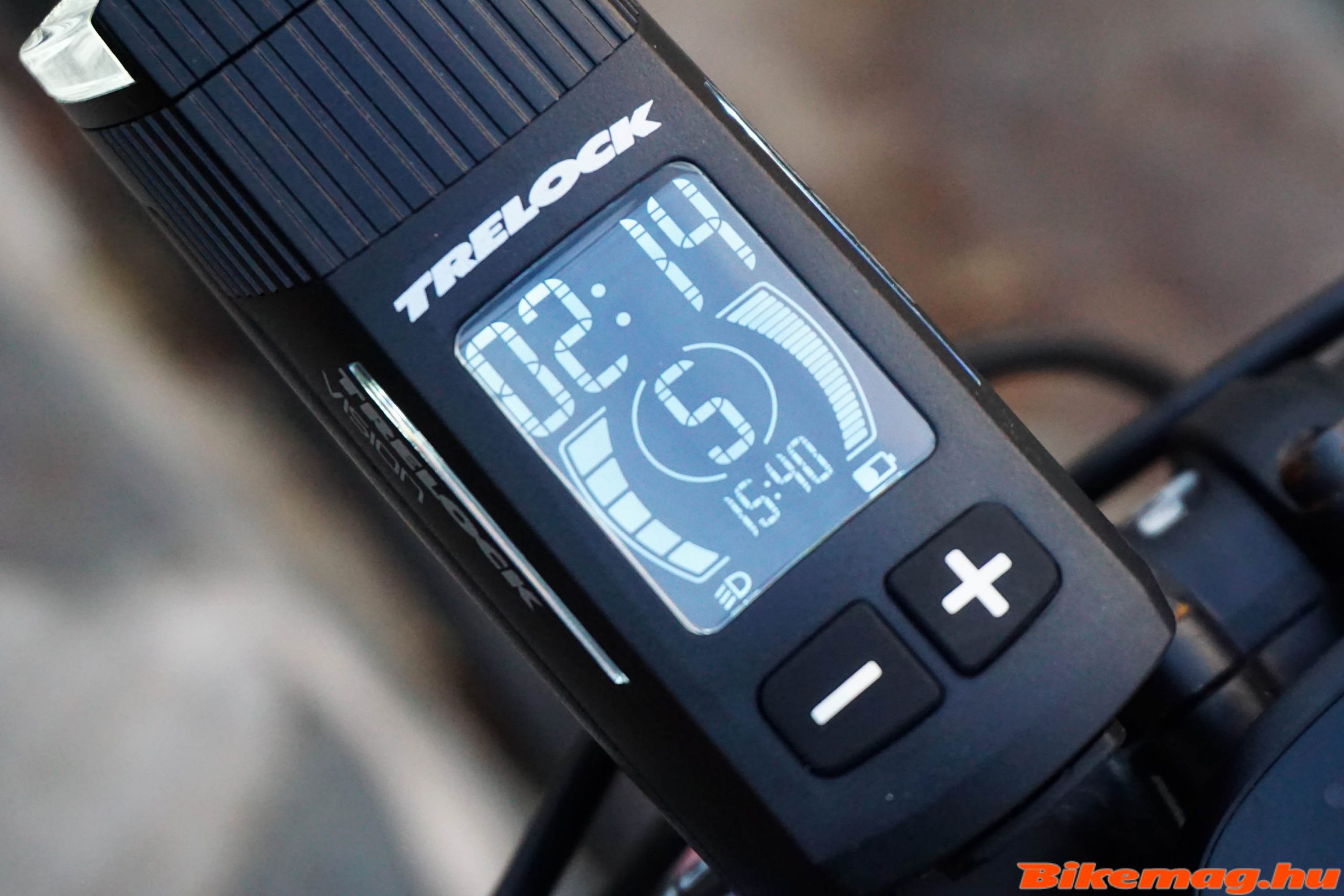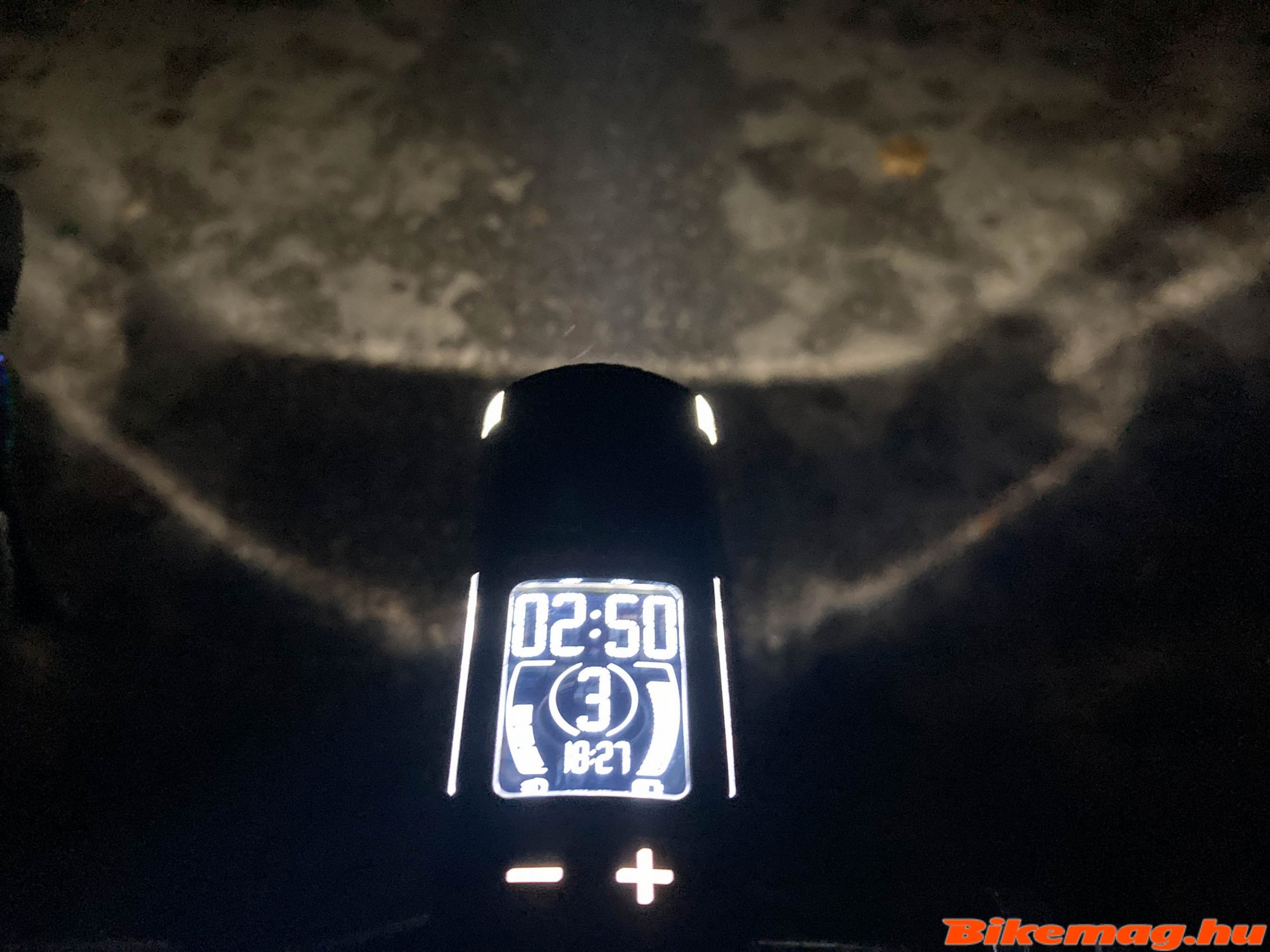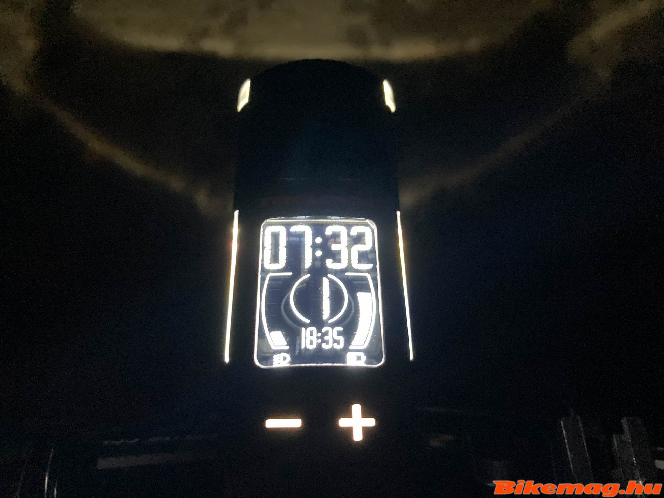 Na, de vissza az első lámpához! A felszereléssel kapcsolatban fontos megemlíteni, hogy egy olyan funkciót is épített bele a Trelock, ami segít a megfelelő szögbe beállítani a lámpát. Bekapcsolt állapotban a „+” gomb nyomásával megjelenik a szintező, ami mutatja, hogy éppen magasra, alacsonyra vagy pont jól világít a lámpa. Ez azért fontos, hogy egyrészt mi is jól lássunk, másrészt a szemből jövő autósokat se vakítsuk el. Egyébként jobbra-balra is állítható a lámpa, de ahhoz már csavarhúzó is kell és a konzolon tudjuk megtenni.