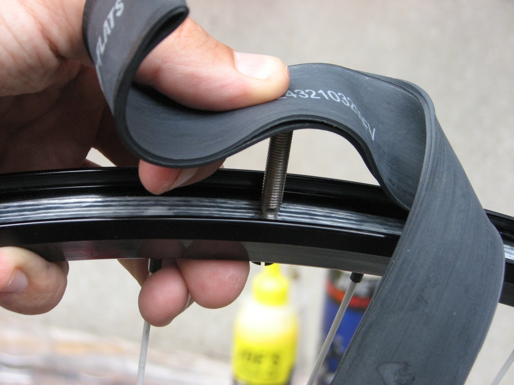 Jöhet a gumiszalag felhelyezése, értelem szerűen a szelepnél kezdjük (fúrjunk kis lyukat olló hegyével a szalagon) és figyeljünk rá, hogy ne gyűrődjön be vagy lógjon túl sehol. Tulajdonképpen hasonló a feladat, mint amikor egy egyszerű felniszalagot teszünk fel. Ujjunkkal adjuk meg mindig az irányt, hogy már eleve középre kerüljön a szalag, akkor kevesebbet kell majd korrigálni.