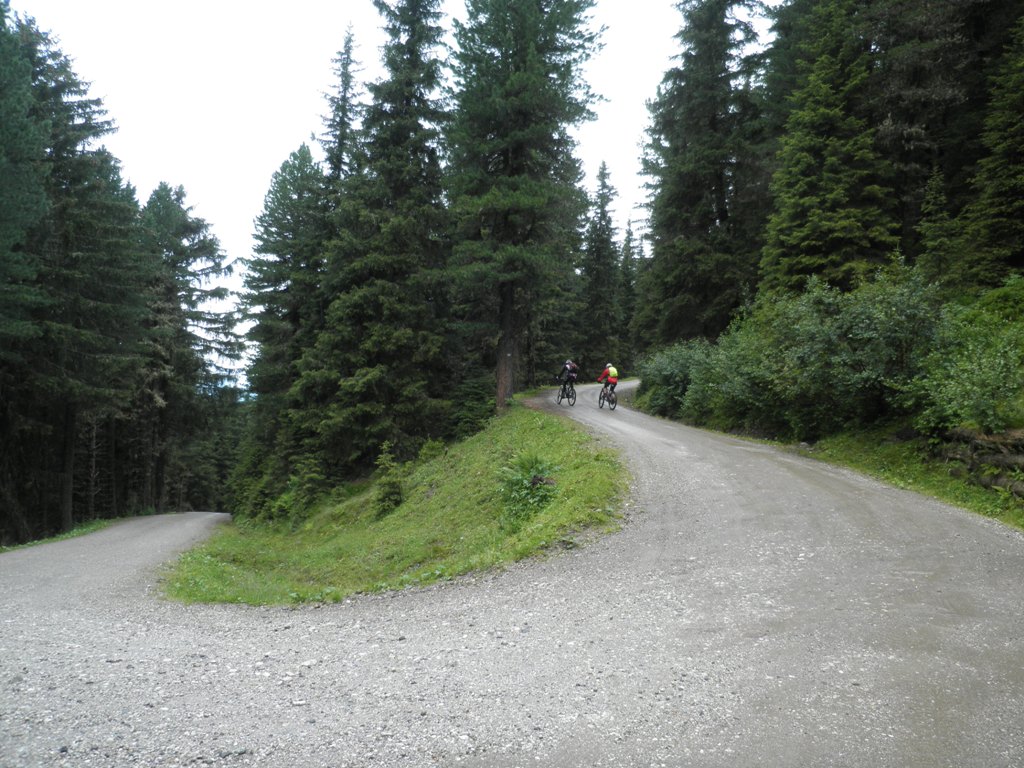 Utolsó előtti nap, cél Madonna di Campiglio, kibővültünk a két új fiúval, állítólag nagyon lájtos kis tekerés lesz, csak a végén kell kicsit mászni, addig bringázgatunk a folyó melletti völgyben, meg ilyenek. Na, persze, már az gyanús volt, hogy annyit gurultunk lefelé, mint máskor a végén. Közben nekem valami nagyon fura tekerés közben, de hatalmas technikai érzékemmel nem tudok rájönni, mi lehet a baj. Annyit nyafogok miatta, hogy azért megállunk, kiderül az egyik láncszem elszakadás előtti utolsó pillanatait éli, hát gyors javítás, kap egy szép kis patentszemet a láncom, s máris vidáman tekerhetek tovább. 20 km-t megyünk tényleg szinte síkon, majd Monclassico mellett be az erdőbe, s kezdődhet a mászás.