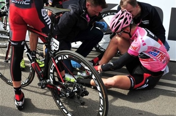 A BMC csapatorvosa, Dario Spinelli megvizsgálta a délutáni bringázás előtt Phinney bokáját, s megállapította, hogy a varratok környéke szépen gyógyul és az ödéma is egyre kisebb.