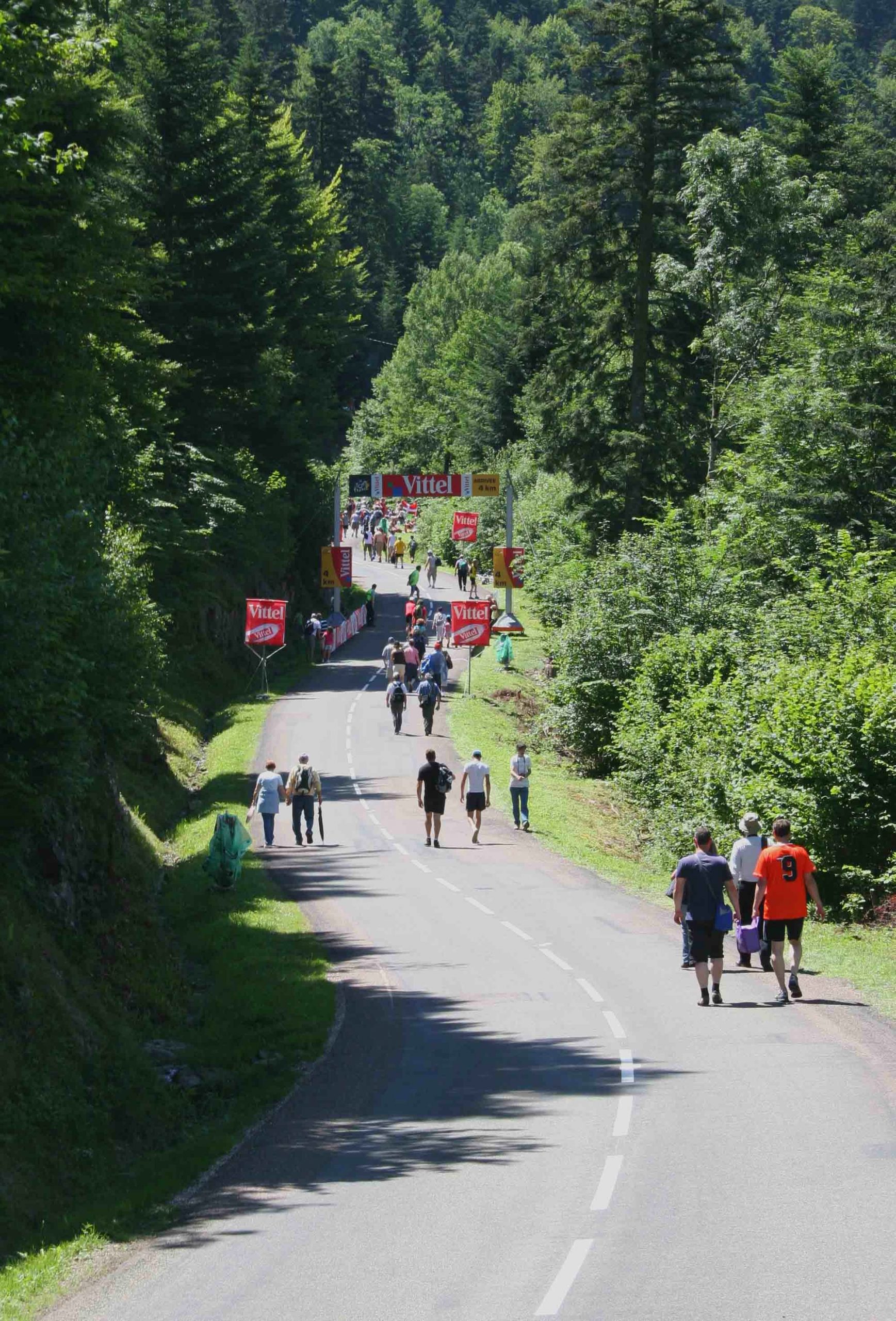 A helyenként 11-13 százalékos emelkedő igazi kihívás még sétálva is, főleg egy 8 éves gyermekkel érkező apukának, de sokan, az igazi fanatikusok, kerékpárral vágtak neki a hegynek, hogy elmondhassák, végigtekertek ott, ahol Wiggins, Evans vagy Nibali. Félreértés ne essék, nem volt ez a séta borzalmas egyáltalán, sőt. Gyönyörű környezetben, hatalmas fákkal szegélyezve kanyargott a kifogástalan minőségű aszfaltcsík felfelé, a két oldalán egyre több letelepedő, jó helyet foglaló nézővel .
