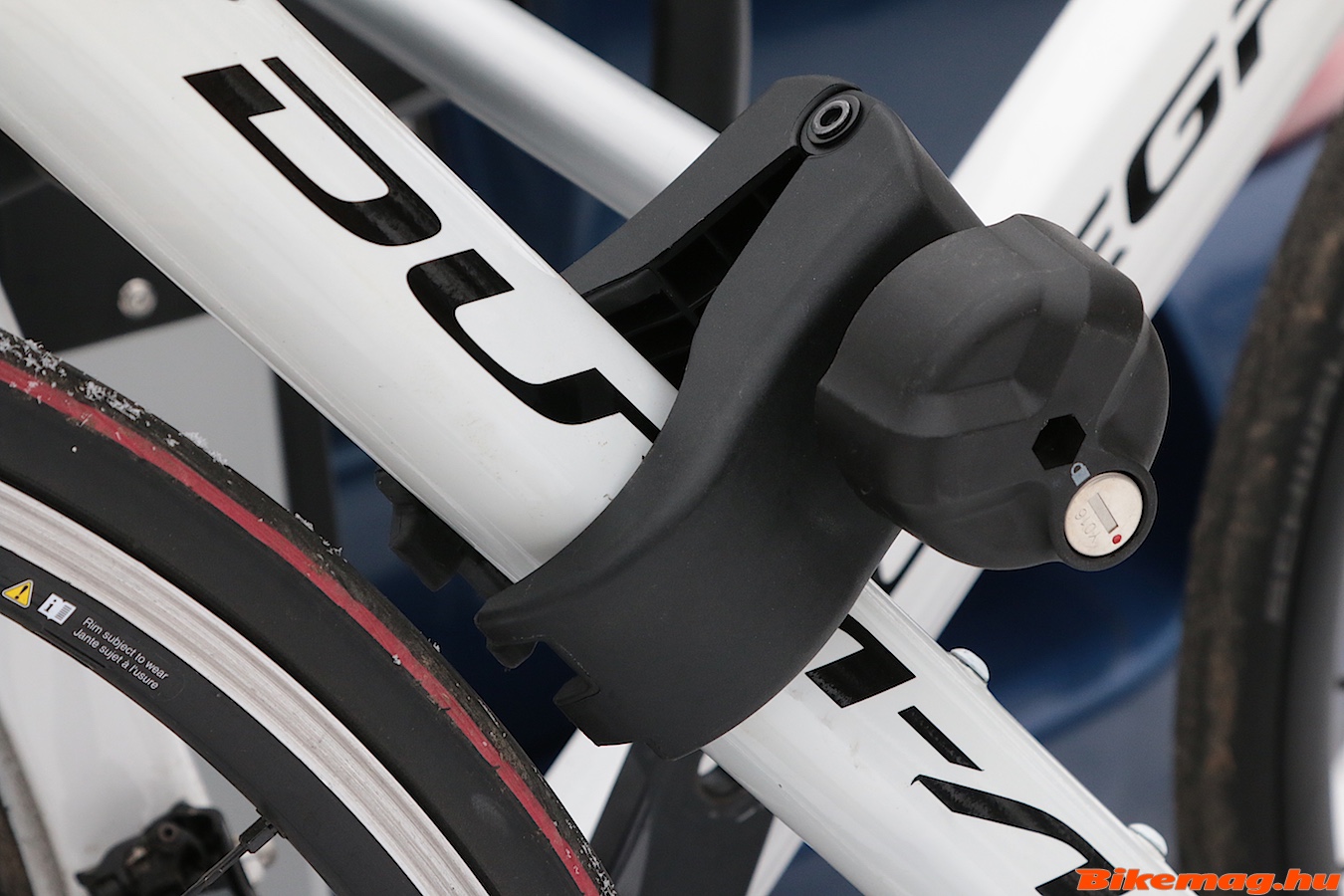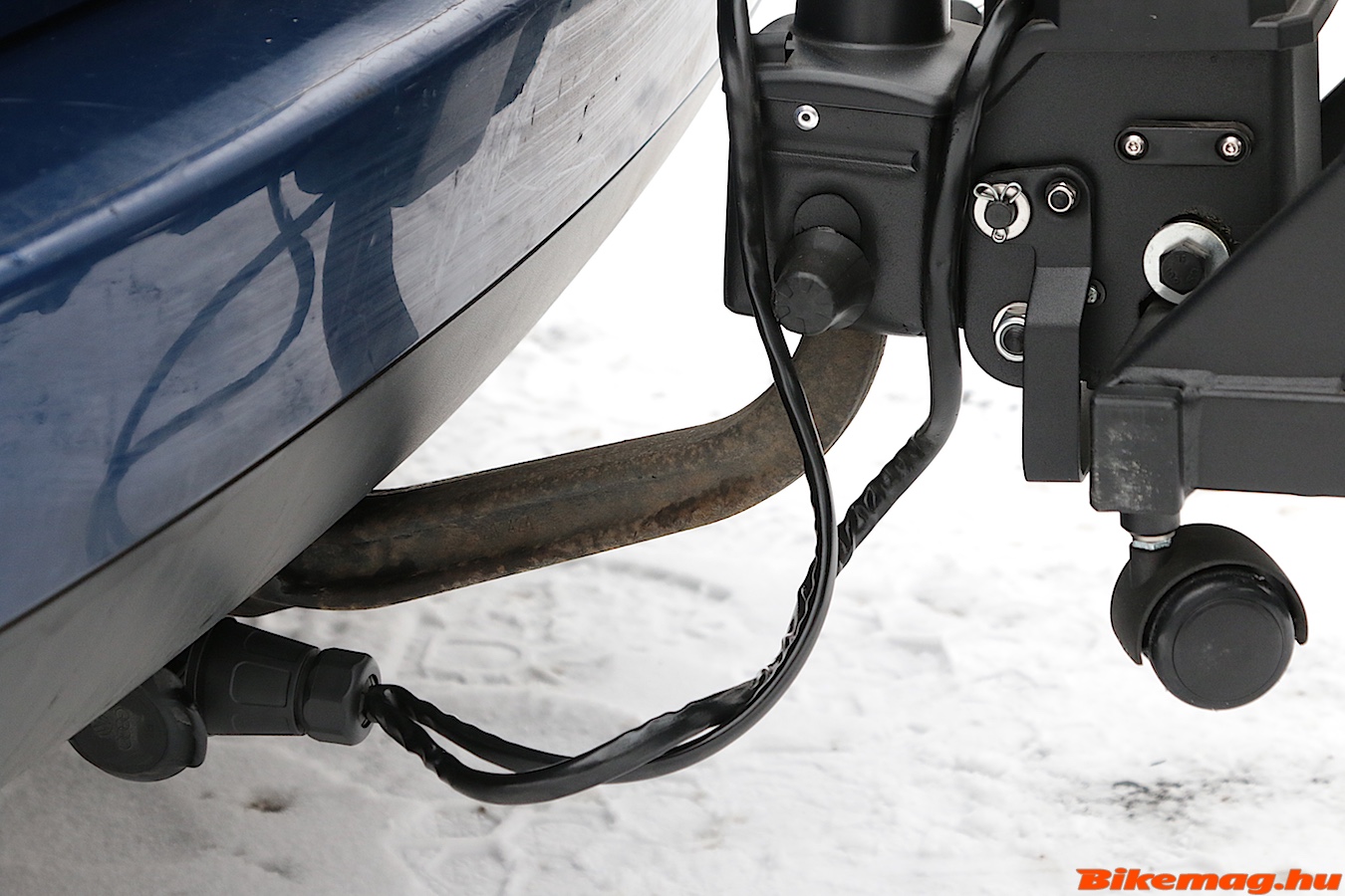A Diamant Bike Lift valójában egy „kettes” Diamant SG3, amit mi is teszteltünk már, sőt meg is tartottam, és immáron harmadik éve nyúzom nagyjából évi 150 alkalommal. Csak kiegészítették egy elektromos lifttel, ami le tudja engedni a bringákat a földig, illetve utána fel is emeli. 60 kg a terhelhetősége, így két elektromos bringát is könnyedén felemel. És azért az ebike-ok is megállnak 25 kiló környékén. Magának a szállítónak az önsúlya 25 kg, de szerencsére kicsire összecsukható, így nem vészes a vonóhorogig felemelni. A lift működéséhez 13 pólusú csatlakozó szükséges az autón, mivel plusz áramot igényel. A fogyasztásától nem kell félni, mi kiszórakoztuk magunkat a fotózás közben és meg sem kottyant az autó saját akkujának. Mivel 40 mm-t meg van ültetve az autóm, ezért leengedéskor majdnem leért a sín aljára szerelt kerék az aszfaltra. Akinek még alacsonyabb az autója, annak sem kell félnie, van egy nyomásérzékelő szenzor ami leállítja a motort, ha leérne a földre. Sajnos így nem lehet megkönnyíteni a hátsó kerekek cseréjét az autón 😀
