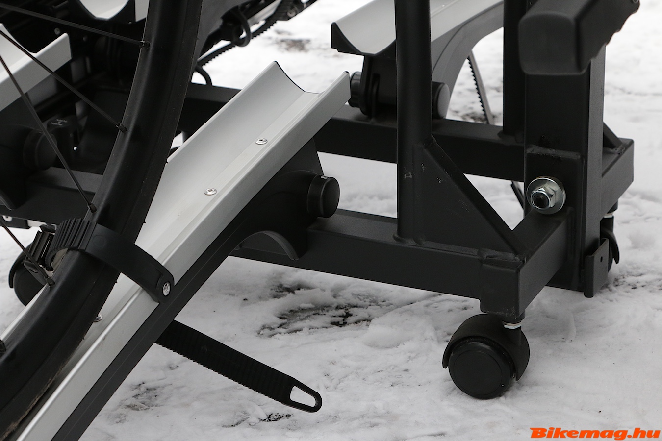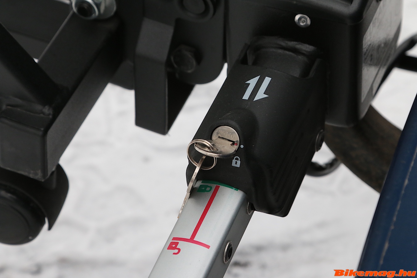 A lift hülyebiztos, a biztonsági stift kiszedése nélkül nem működtethető és ha felső végállásban áll, akkor pedig csipog amíg vissza nem teszed. Természetesen a szabadalmaztatott rögzítési rendszerrel készülő tartó a vonóhorogra rázárható és a bringákat is ugyanazzal a kulccsal tudod fixálni. Nagy öröm, hogy a karok felfogatásán változtattak, így most már nem csak csúsztatni tudod a tartó fém vázán, hanem egyszerűen leveszed és oda teszed fel, ahol a bringa rögzítése szempontjából a legkényelmesebb. Sőt mi több, ezeket a karokat megveheted a régebbi tartódhoz is! A keréksínek a pluszos kerékméretet is fogadják, de a racsnis pántok a fatbike kereket is átfogják. Maga a tartó dönthető is, méghozzá a toronnyal együtt, így a hátsó ajtó nyitását nem akadályozza. Az aljára szerelt négy kerék megkönnyíti a mozgatását. Ahogy minden Pro-User tartónak, úgy ennek is minden része cserélhető, így ha nekitolatnál valaminek, vagy baleset éri, akkor is javítható. Sőt, most már rászerelhető, vezeték nélküli tolatóradart is vehetsz hozzá, így könnyebbé válik a tolatás.