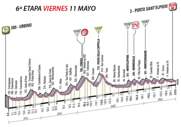 Május 11. – 6. szakasz: Urbino – Porto Sant’Elpidio, 210 km Várható befutó: 16:55-17:30