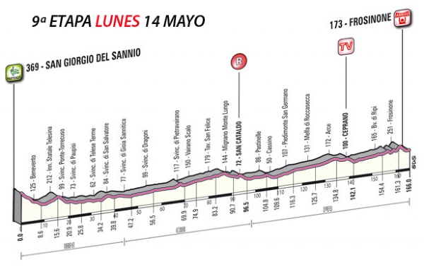 Május 14. – 9. szakasz: San Giorgio nel Sannio – Frosinone, 166 km Várható befutó: 17:06-17:29