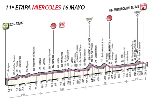 Május 16. – 11. szakasz: Assisi – Montecatini Terme, 255 km Várható befutó: 16:59-17:37