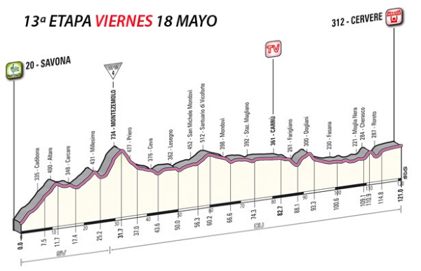 Május 18. – 13. szakasz: Savona – Cervere, 121 km Várható befutó: 17:06-17:22