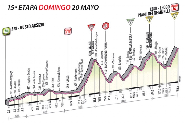 Május 20. – 15. szakasz: Busto Arsizio – Lecco/Pian dei Resinelli, 169 km. (hegyi befutó) Várható befutó: 17:04-17:37