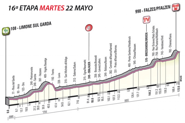 Május 22. – 16. szakasz: Limone sul Garda – Falzes/Pfalzen, 173 km Várható befutó: 17:01-17:26
