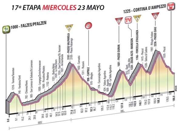 Május 23. – 17. szakasz: Falzes/Pfalzen – Cortina d’Ampezzo, 186 km Várható befutó: 16:56 / 17:33
